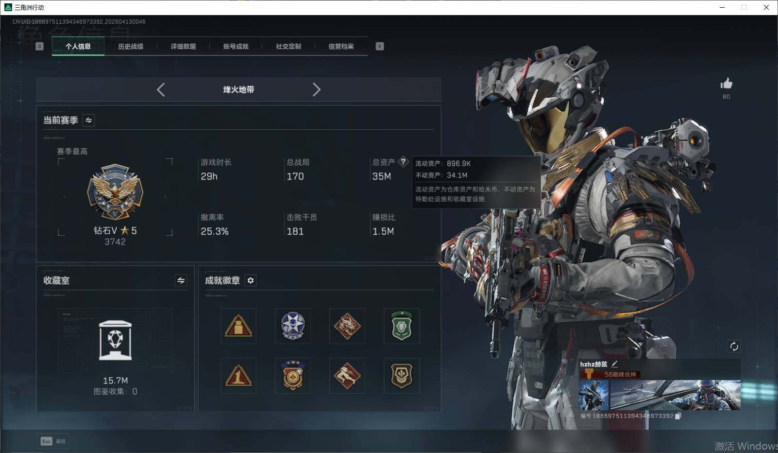 34m总资产-66k哈夫币-60烽火等级-钻石-21战场等级-列兵【干员外观