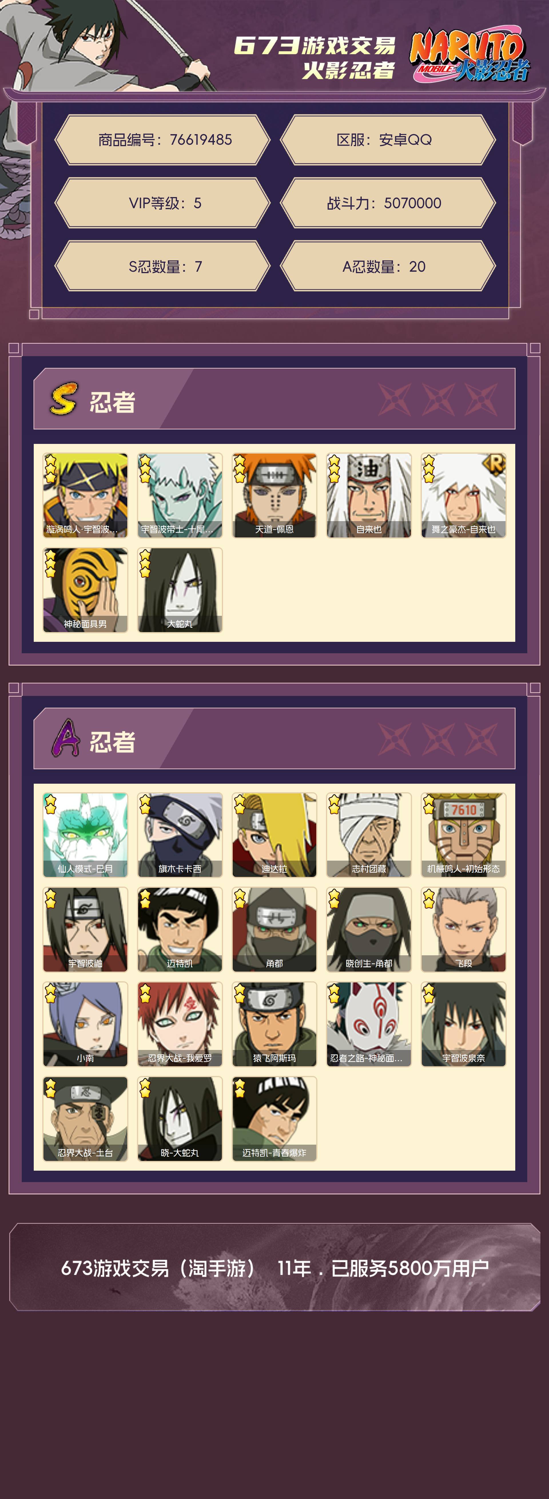 角色等级123 金币3000 战斗力5070000 S忍7 A忍20 5星S忍者2 5 段位暗部