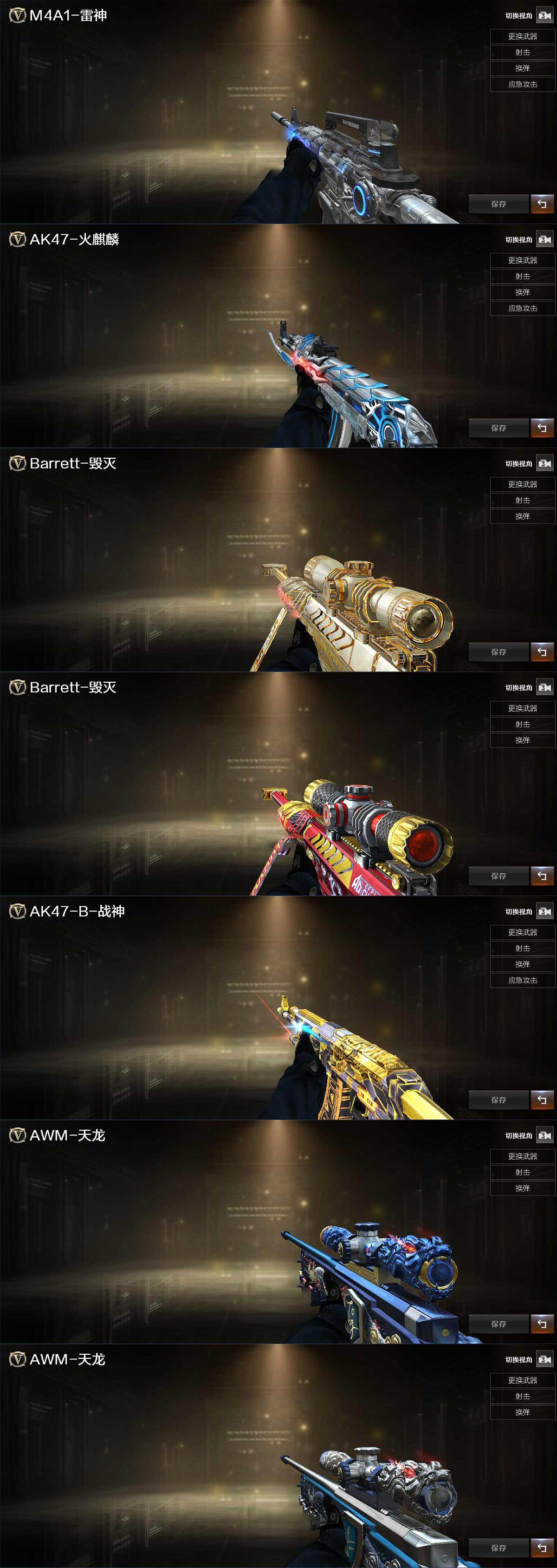 【皮肤】:雷神-星空,火麒麟-雷神,毁灭耀金皮肤,毁灭-AG-CFPLS15冠军,战神-流金岁月皮肤,AWM-天龙-传奇70KG,AWM-天龙-传奇白鲨