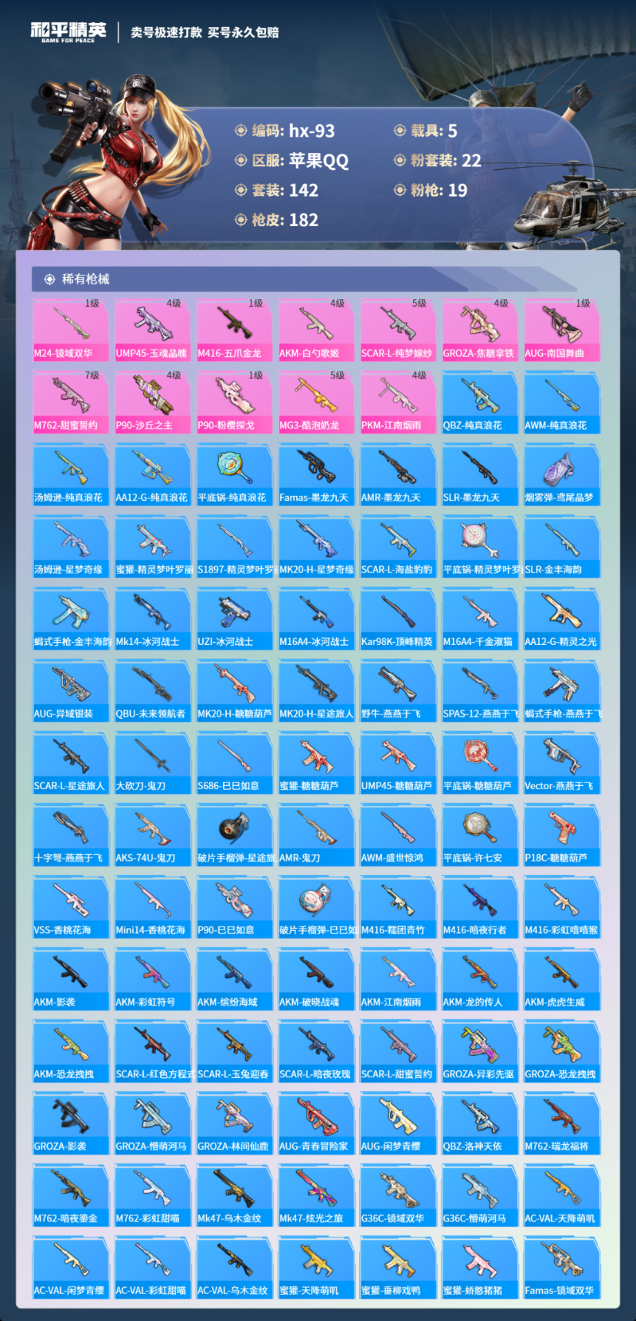 5载具142套装-182枪皮-苹果手Q-11王牌印记-22粉装-19特效枪-5载具-79538热力值-142套装-182枪皮-0卓越印记-0传奇印记