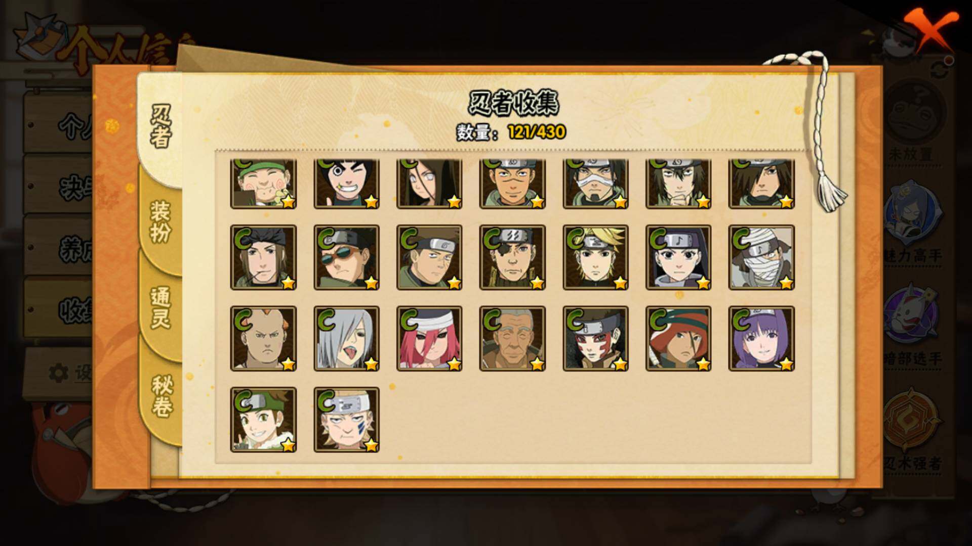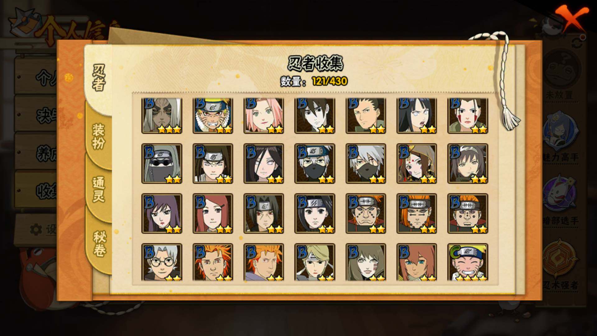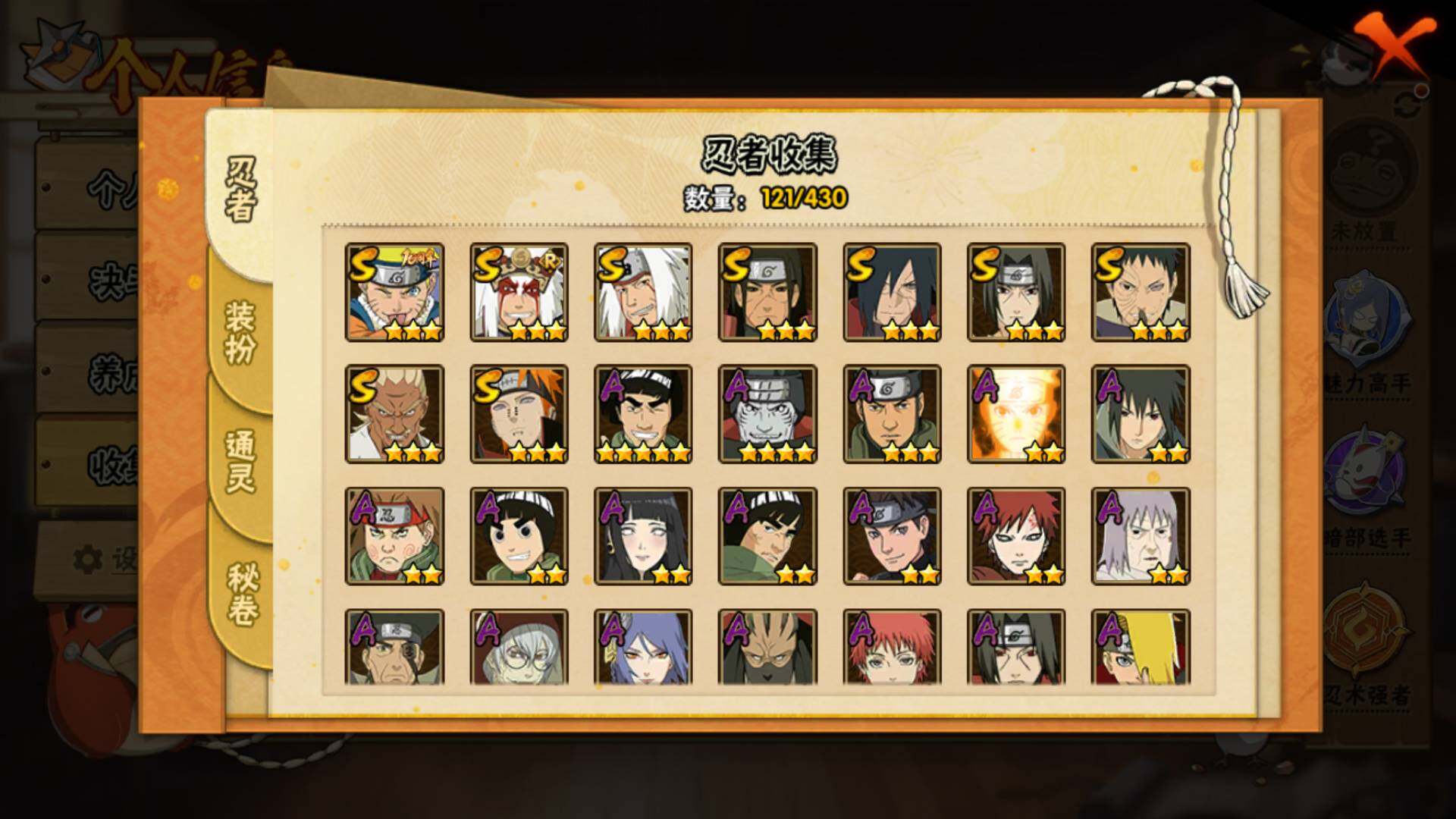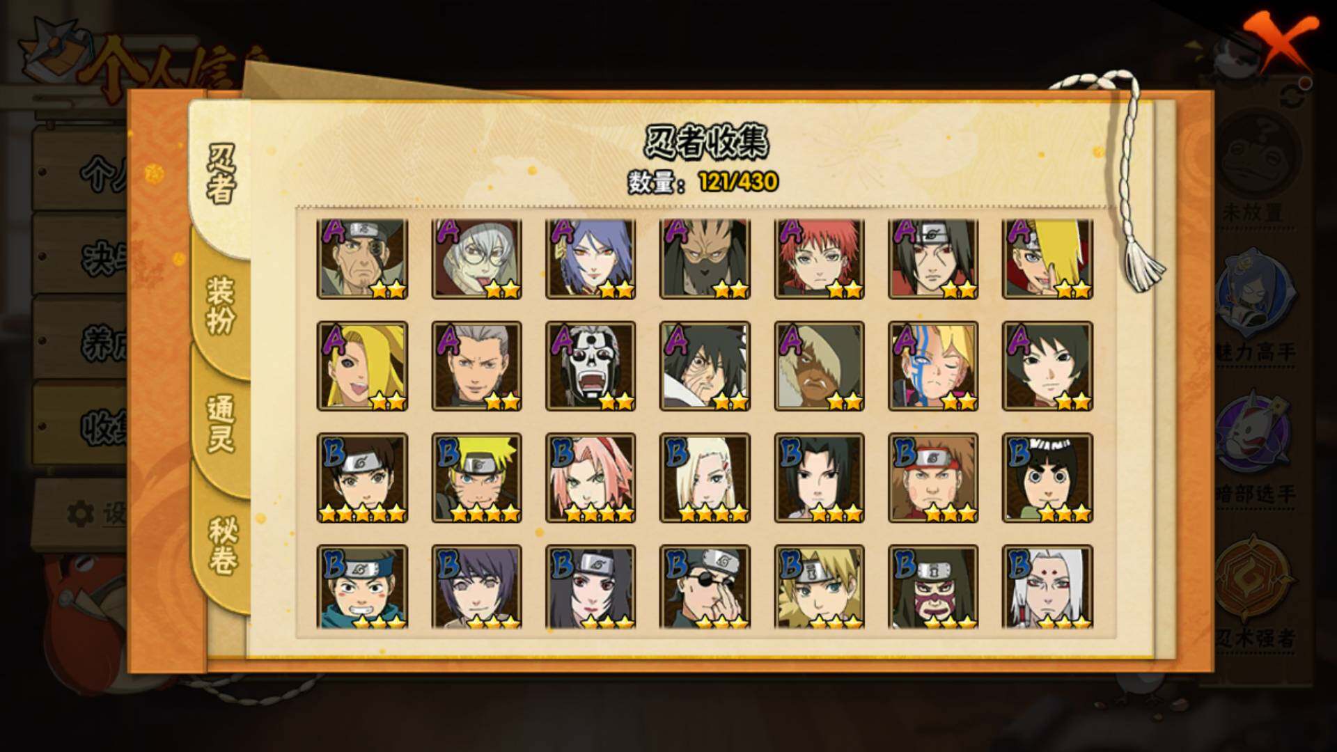 【S级忍者】:千手柱间「秽土转生」(3星),宇智波斑「秽土转生·解」(3星),宇智波带土「忍界大战」(3星),艾「忍界大战」(3星),宇智波鼬「须佐能乎」(3星),自来也「舞之豪杰」(3星),自来也「传说中的三忍」(3星),佩恩「天道」(3星),漩涡鸣人·宇智波佐助(3星)