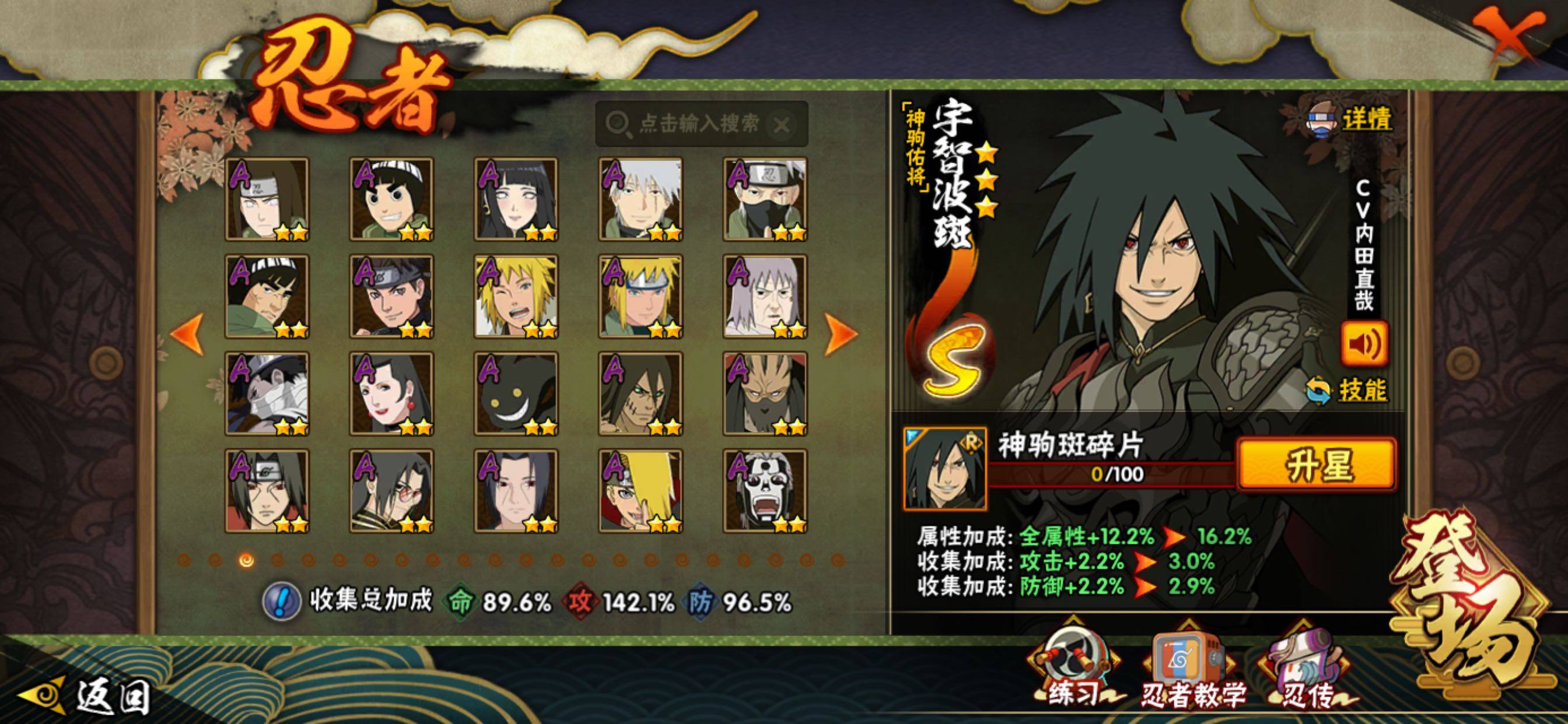 【S级忍者】:猿飞日斩「秽土转生」(3星),波风水门「秽土转生」(3星),千手扉间「秽土转生」(3星),宇智波斑「秽土转生」(3星),宇智波斑「秽土转生·解」(3星),艾「忍界大战」(3星),宇智波鼬「须佐能乎」(3星),宇智波止水「须佐能乎」(3星),旗木卡卡西「须佐能乎」(3星),千手柱间「木叶创立」(3星),烈斗「初代目风影」(3星),自来也(3星),自来也