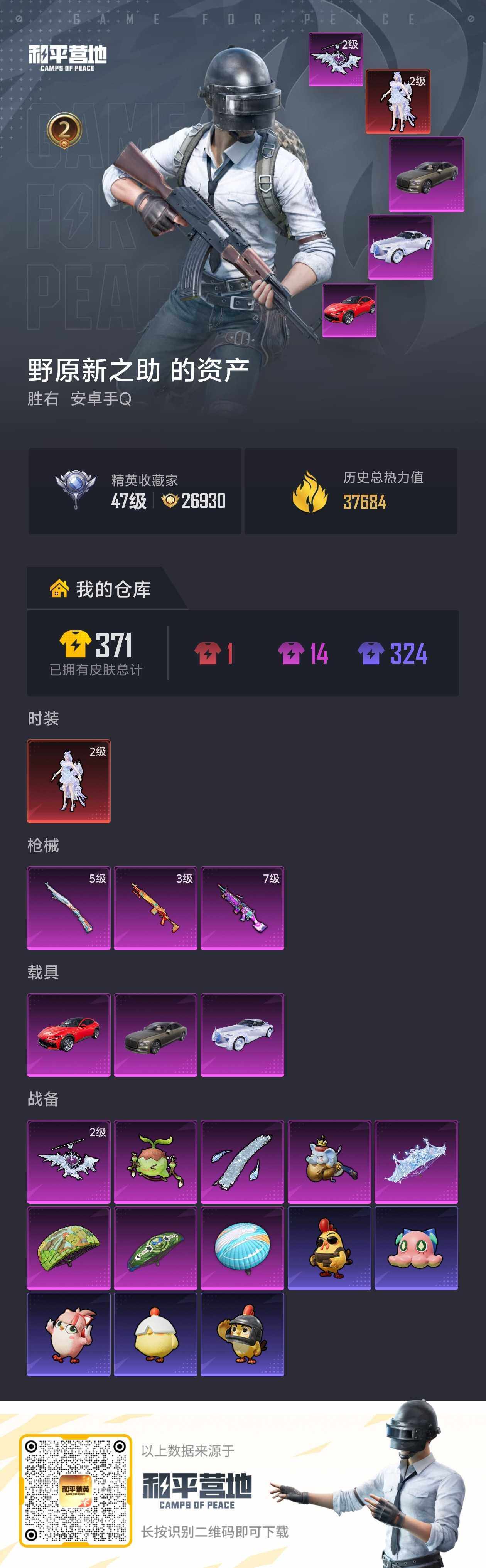 【双字id:胜右】安卓 手Q-1神装-0粉装-3特效枪-3载具-4粉色飞行器-37684热力值-2王牌印记-85套装-106枪皮【红色神装等级】:百变纱华-安妮(二级)【红色角色神装】:百变纱华-安妮【热门品类】:套装-浪漫天命,套装-深海小丑鱼,套装-暗影哥特,套装-粉红小猪【粉色枪皮等级】:Kar98K-巳巳如意(五级),Mk14-福马献瑞(三级),M249-蓝莓炮弹(七级)【粉色载具】:法