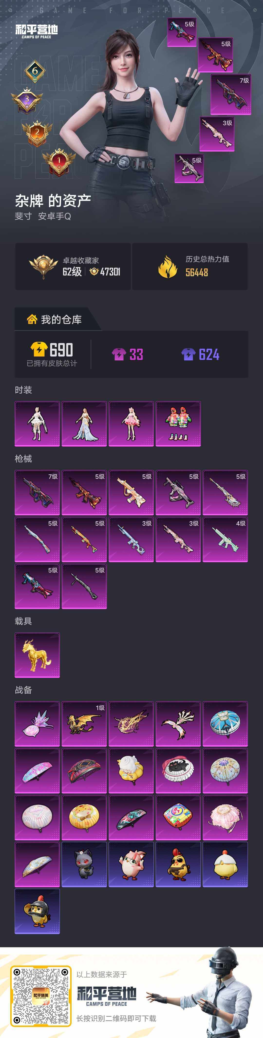 【便宜出:4粉装-12特效枪-1载具】安卓 手Q-4粉色飞行器-56453热力值-6王牌印记-116套装-211枪皮【热门品类】:套装-龟仙人,套装-暗影哥特【粉色套装】:粉装-炫光之旅,角色-千金淑猫,角色-樱桃泡泡,角色-智耀战神【粉色枪皮等级】:M416-风花雪月(五级),GROZA-镜光银凌(五级),AUG-星之彼岸(七级),AUG-暖羊咩咩(五级),Kar98K-巳巳如意(五级),Mk