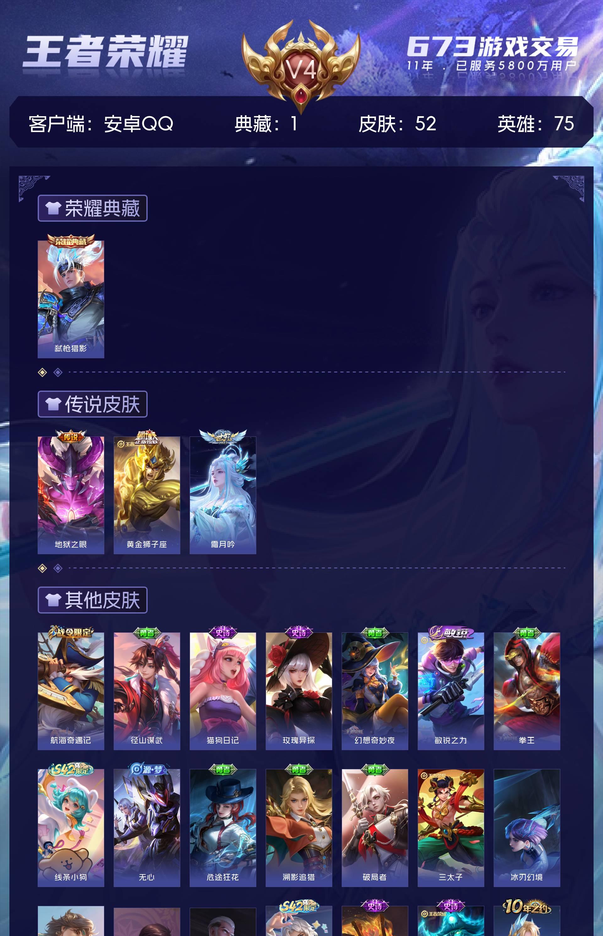 V4 皮肤52 英雄75 至尊星耀 荣耀典藏1 星传说1 传说3