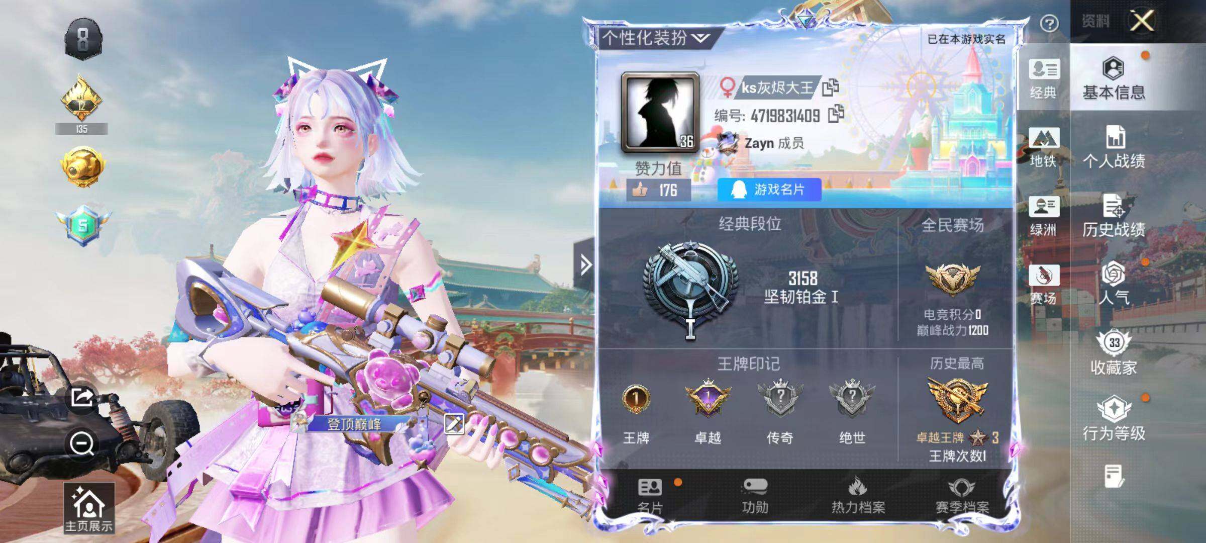 粉枪3/珍稀飞行器123373,130245/套装70/枪皮85/热力值20841/历史最高段位:王牌印记1次/Lv:36/五级Kar98K-巳巳如意/五级Mk14-甜梦熊击/五级DP-28-豹影疾电/Kar98K-巳巳如意/Mk14-甜梦熊击/DP-28-豹影疾电/绝对恒星飞行器/炫彩糖果飞行器/绝对恒星降落伞/喜羊羊与灰太狼降落伞/炫彩糖果降落伞/巳巳如意/角色-甜心蒙太奇/套装-雪国风尚/