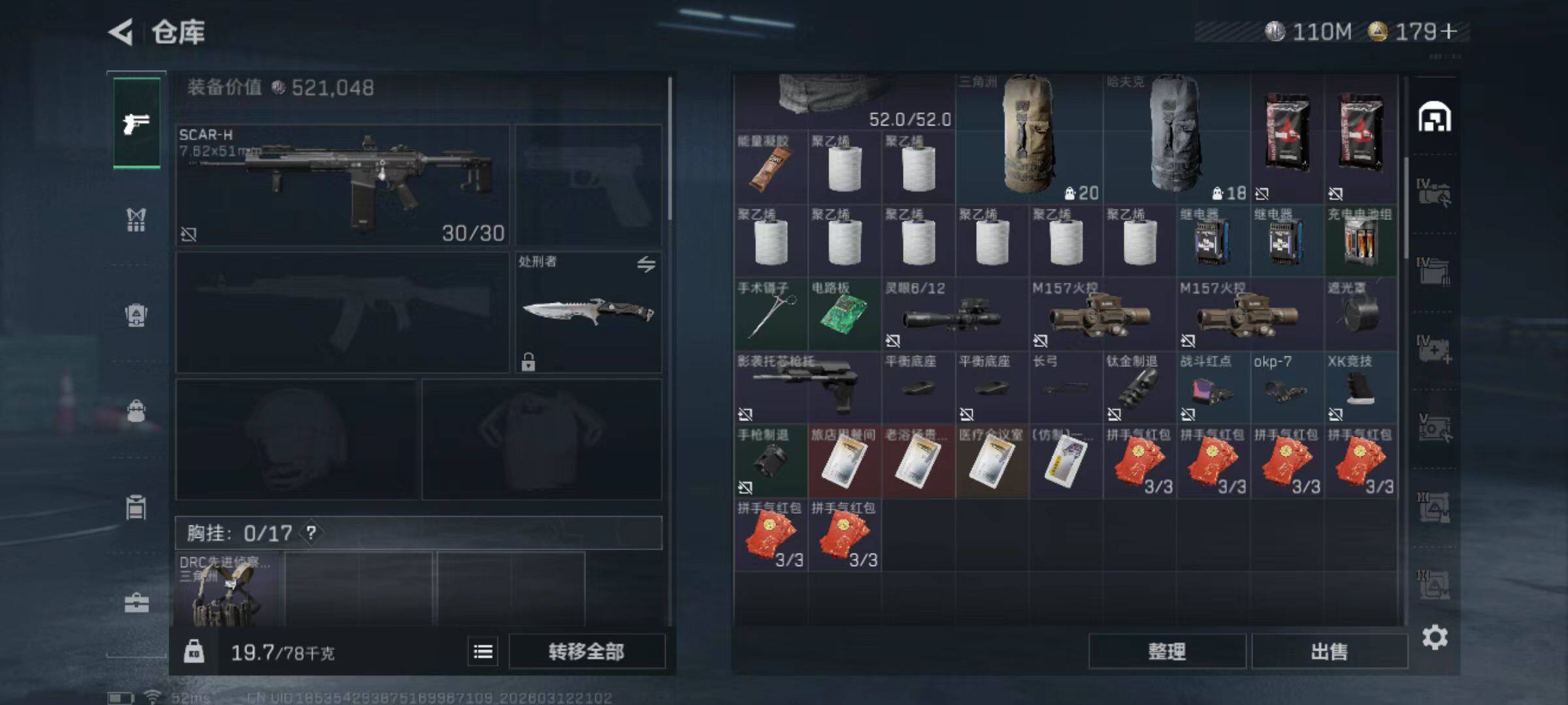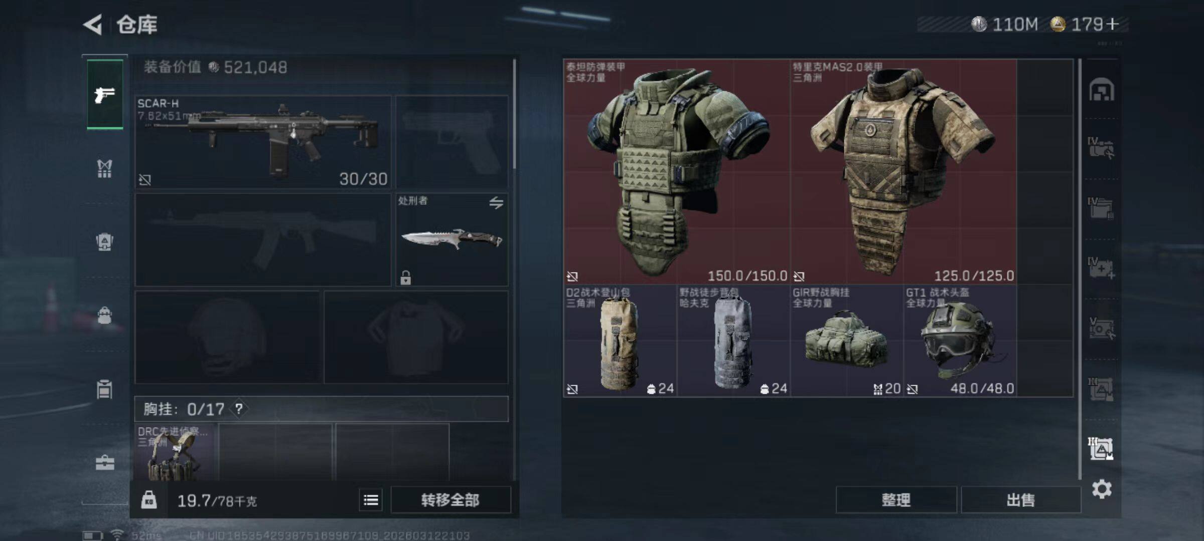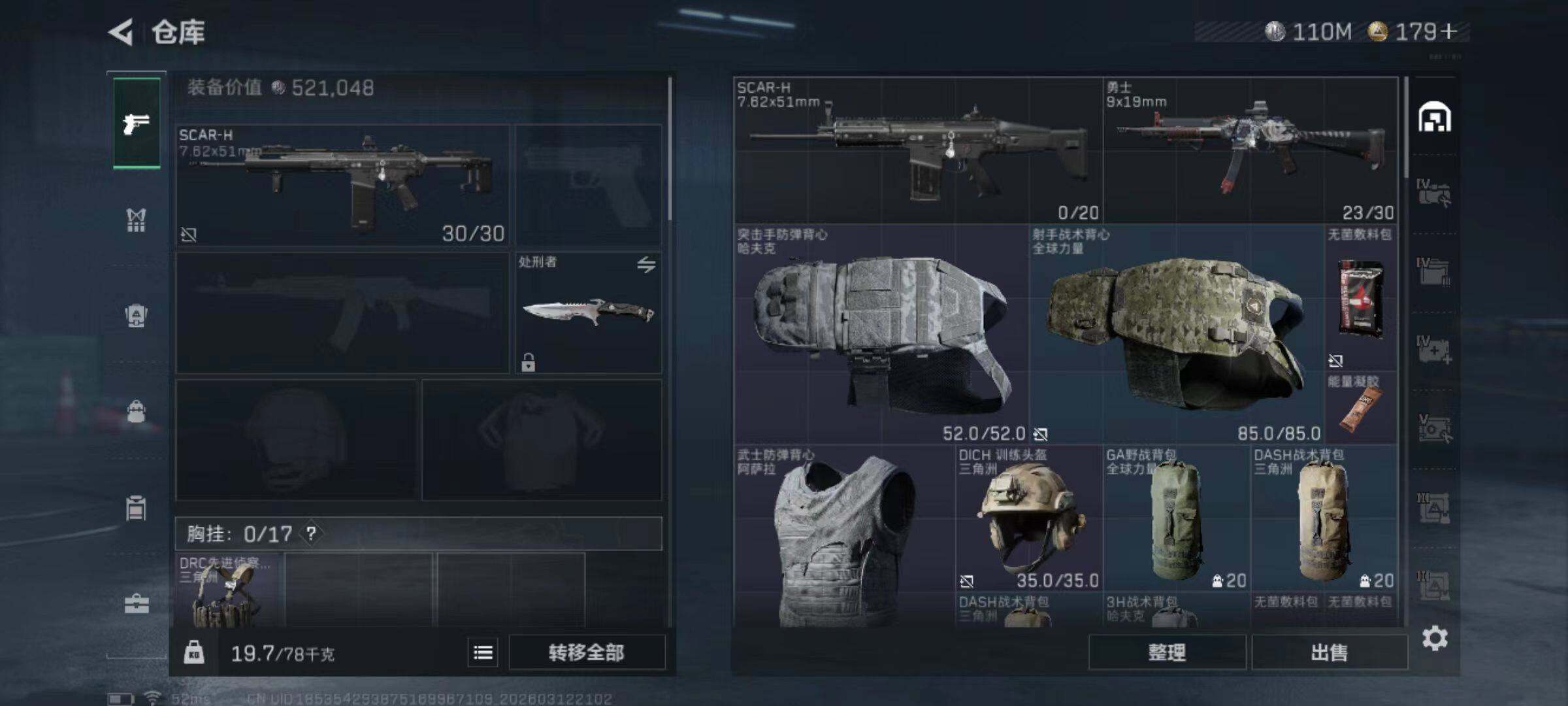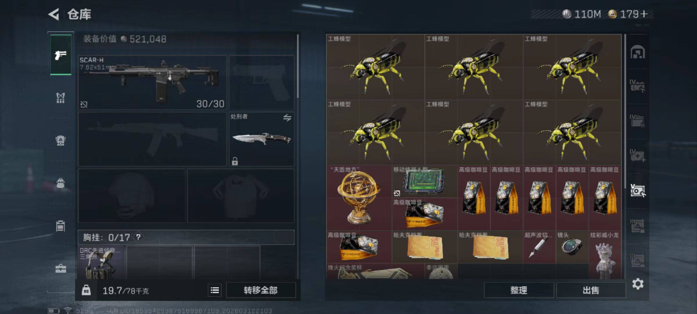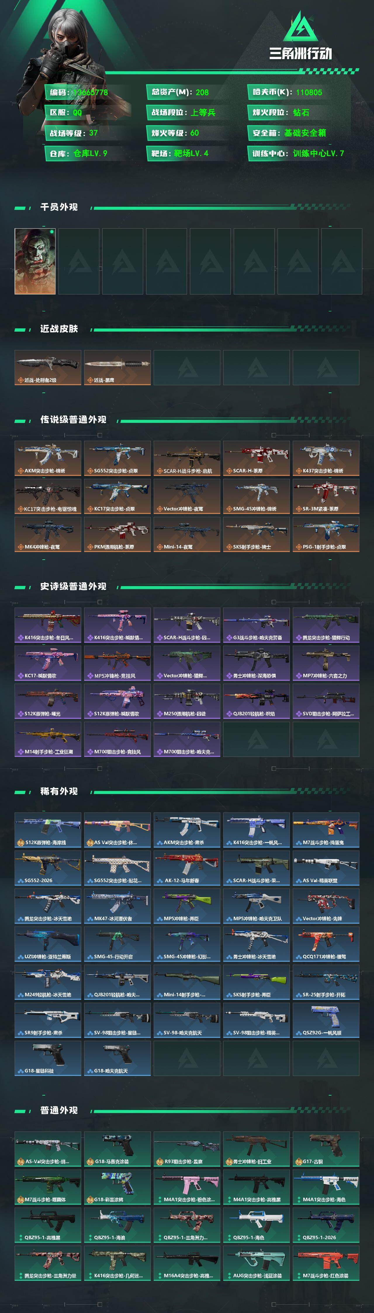 总资产208M/哈夫币11080万/传说近战数1/传说枪皮数15/战场等级37/行动等级60/安全箱等时效性道具以游戏内数据为准,详情请看图/藏品-非洲之心/红狼-电锯惊魂/近战-处刑者2级/近战-黑鹰/AKM突击步枪-锦绣/SG552突击步枪-点翠/SCAR-H战斗步枪-启航/SCAR-H战斗步枪-荼蘼/K437突击步枪-锦绣/KC17突击步枪-电锯惊魂/KC17突击步枪-点翠/Vector冲