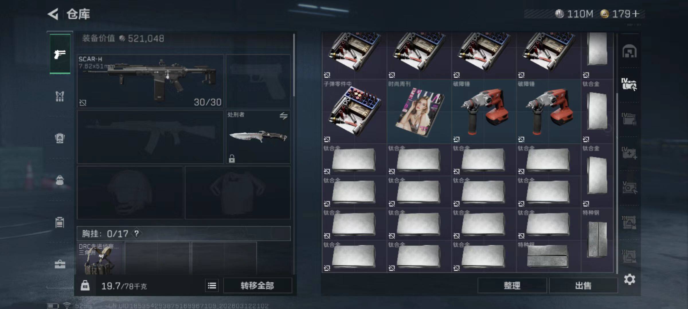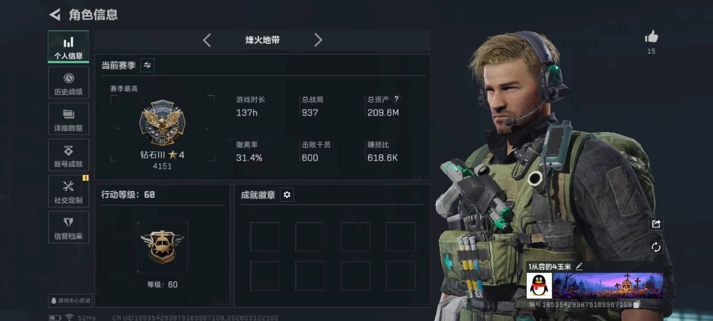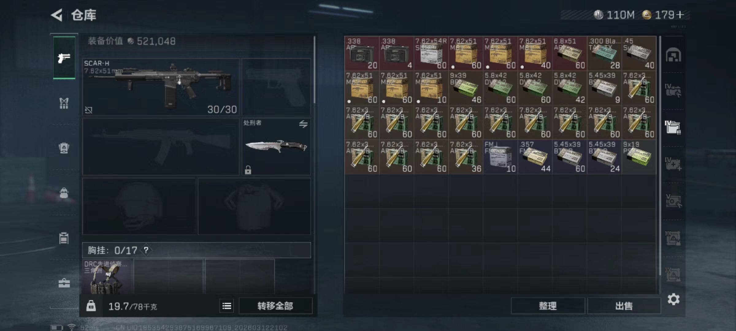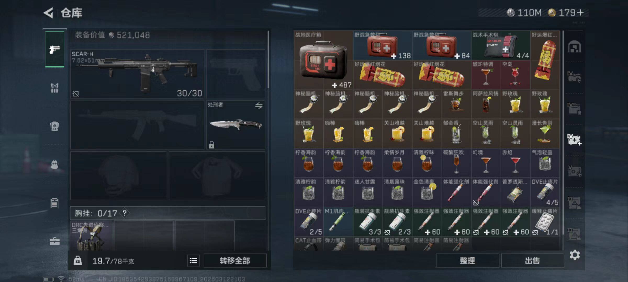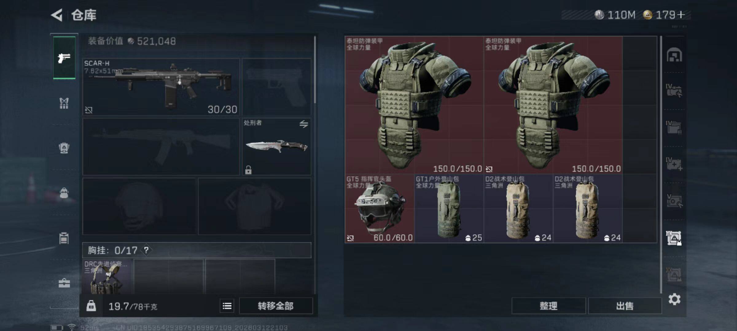 总资产208M/哈夫币11080万/传说近战数1/传说枪皮数15/战场等级37/行动等级60/安全箱等时效性道具以游戏内数据为准,详情请看图/藏品-非洲之心/红狼-电锯惊魂/近战-处刑者2级/近战-黑鹰/AKM突击步枪-锦绣/SG552突击步枪-点翠/SCAR-H战斗步枪-启航/SCAR-H战斗步枪-荼蘼/K437突击步枪-锦绣/KC17突击步枪-电锯惊魂/KC17突击步枪-点翠/Vector冲