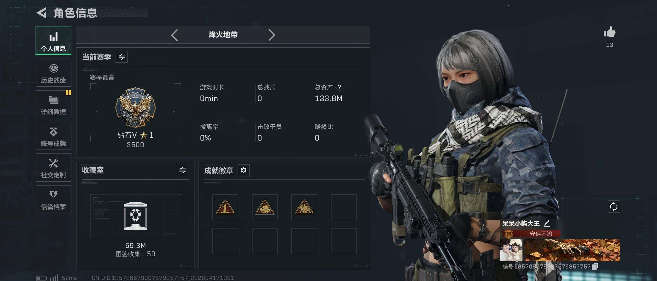 133m总资产-803k哈夫币-60烽火等级-钻石-11战场等级-列兵【干员