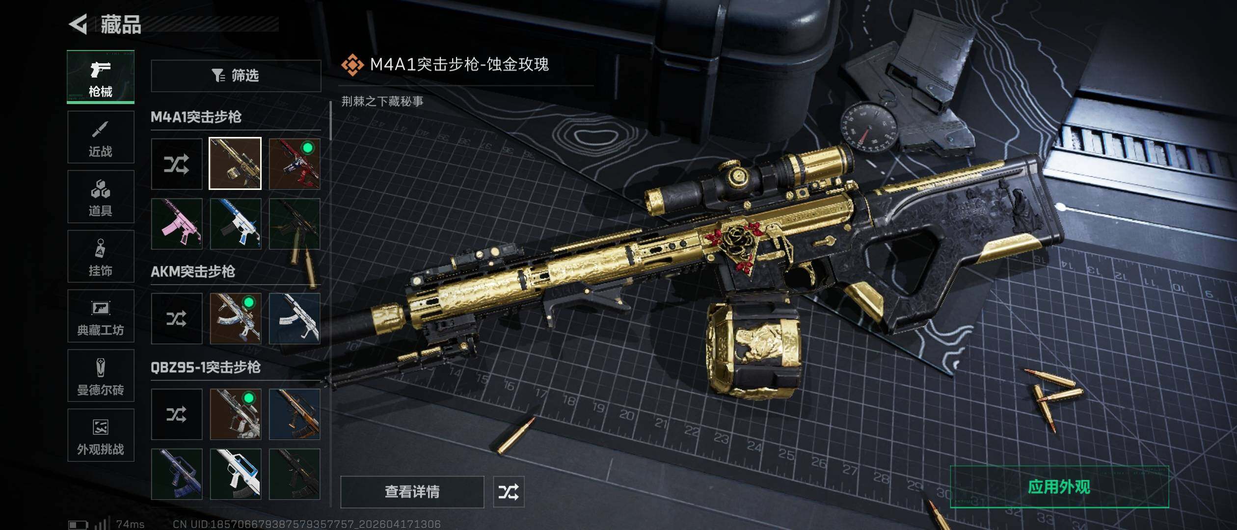 【传说外观】:M4A1突击步枪-蚀金玫瑰,M4A1突击步枪-阿米娅,AKM突击步枪-锦绣,QBZ95-1突击步枪-凌霄戍卫,ASh-12战斗步枪-鹅鸭杀,AUG突击步枪-悠然茶歇,M7战斗步枪-怜悯,SCAR-H战斗步枪-