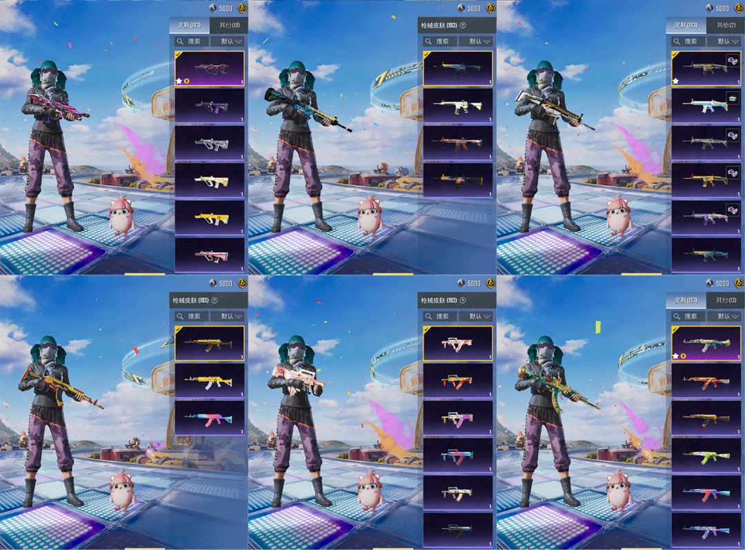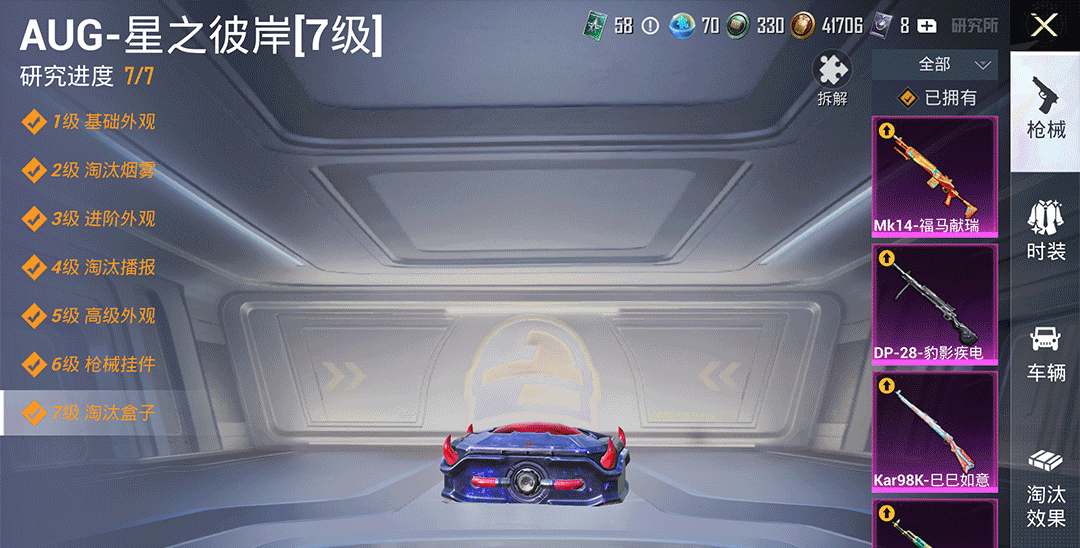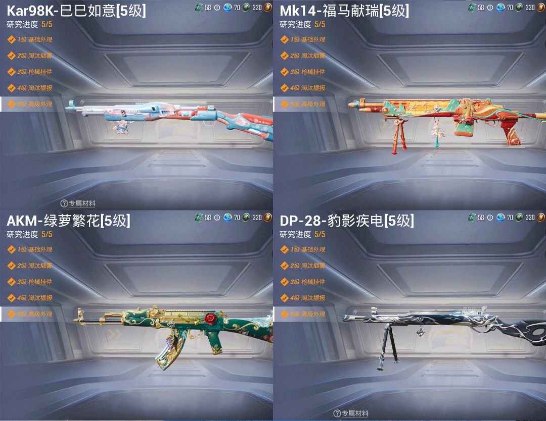 特效枪5:AUG-星之彼岸/7级,,Mk14-福马献瑞/5级,,DP-28-豹影疾电/5级,,Kar98K-巳巳如意/5级,,AKM-绿萝繁花/5级,,