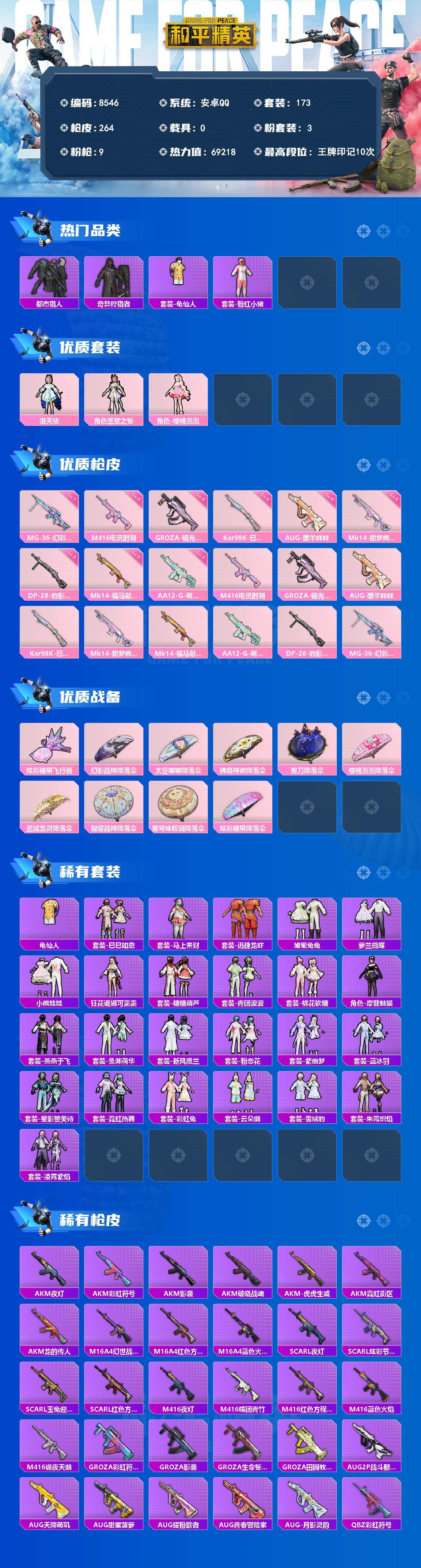 【8546】3粉装-9特效枪-0载具-1粉色飞行器-69218热力值-10王牌印记-173套装-264枪皮