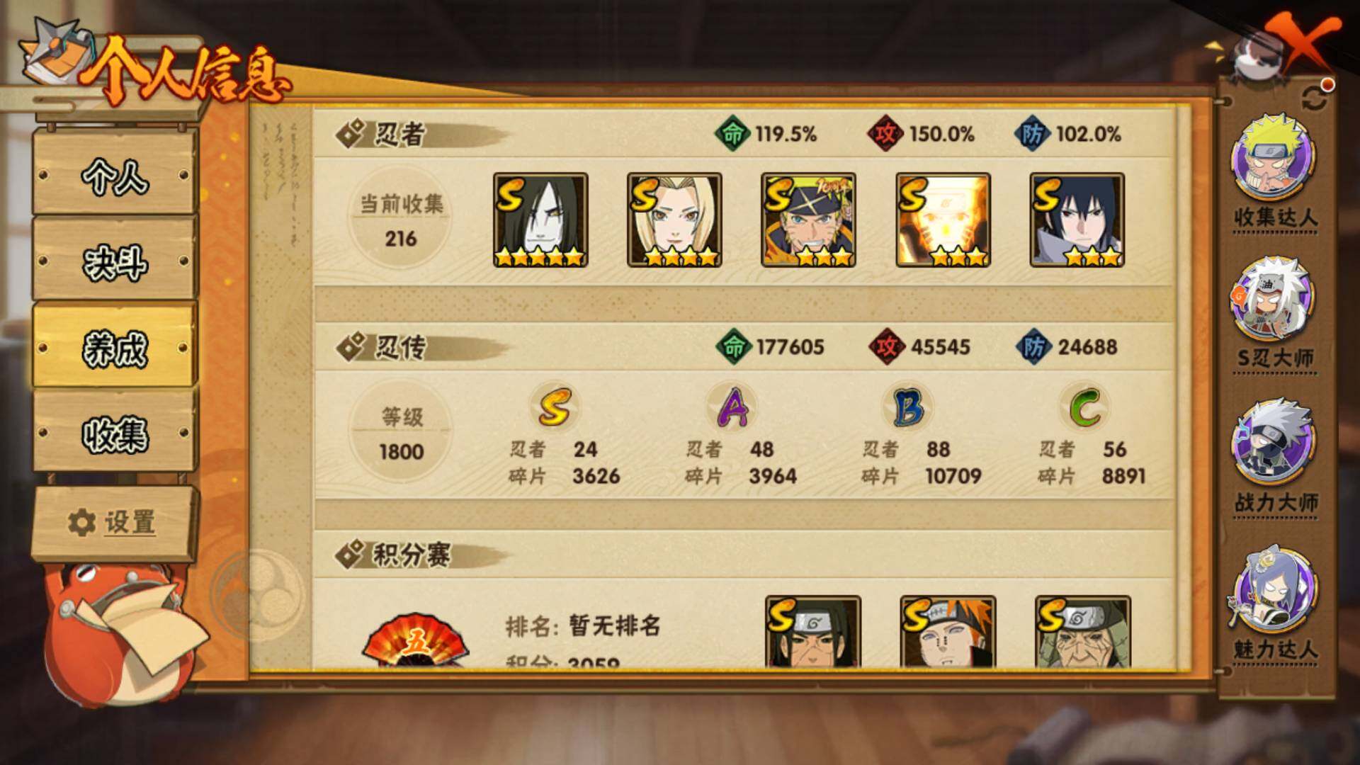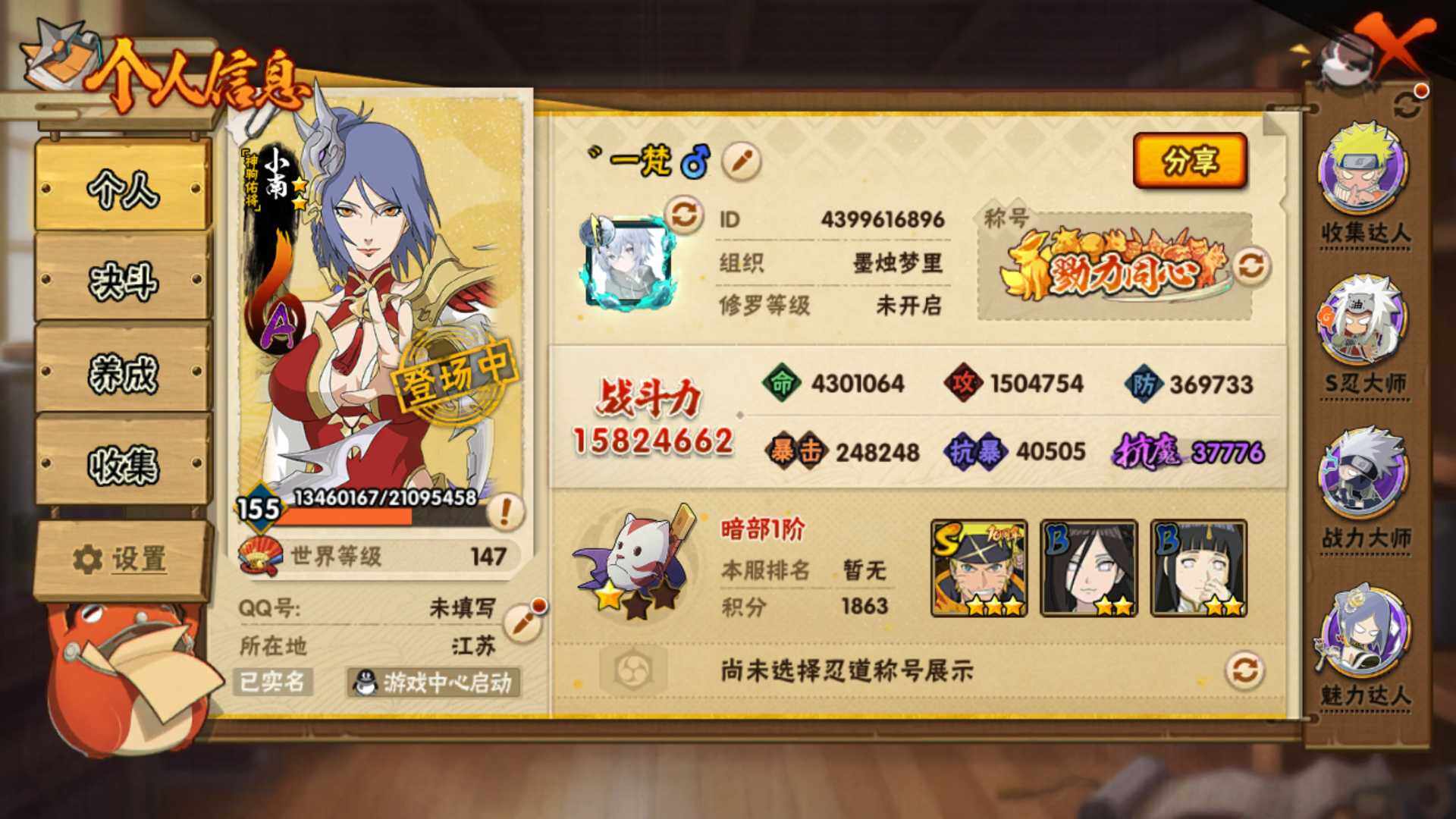 (可免费转苹果)V8 24S 48A 1582万战力 已购25忍法帖 热门A最终章雏田 忍战我爱罗 妖怪纲手 侠隐大野木 S碎片自来也88片 仙人自来也40片 金水门94片 红夜带土45片 十尾带土44片 创立柱间55片 大野木65片 舍人80片 无75片 YY2142