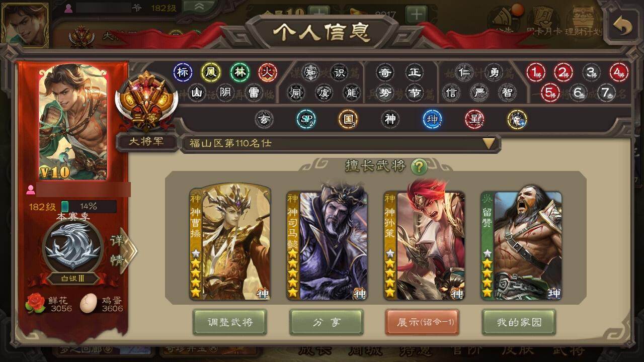 官阶:大将军 VIP等级:VIP10级 史诗武将数:40 动态皮肤数:27 武