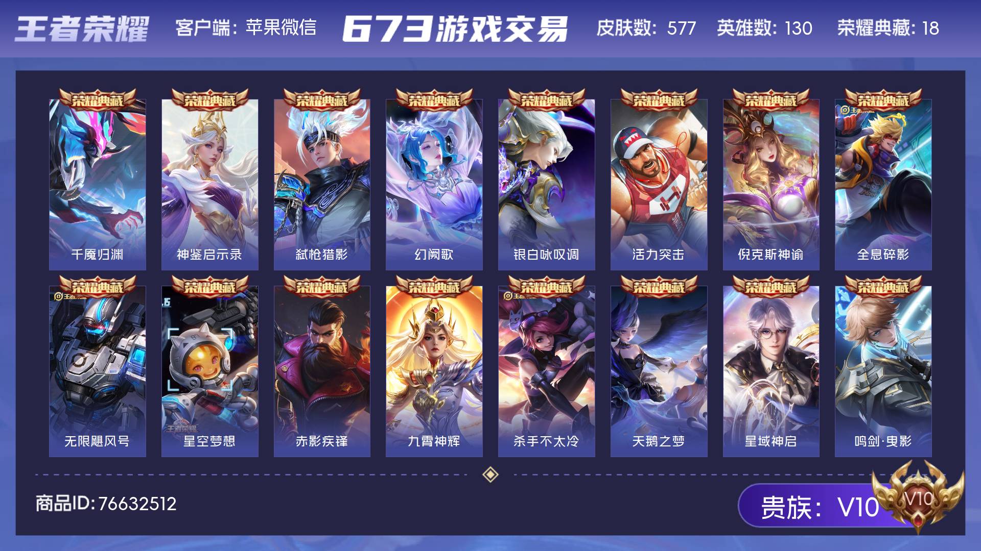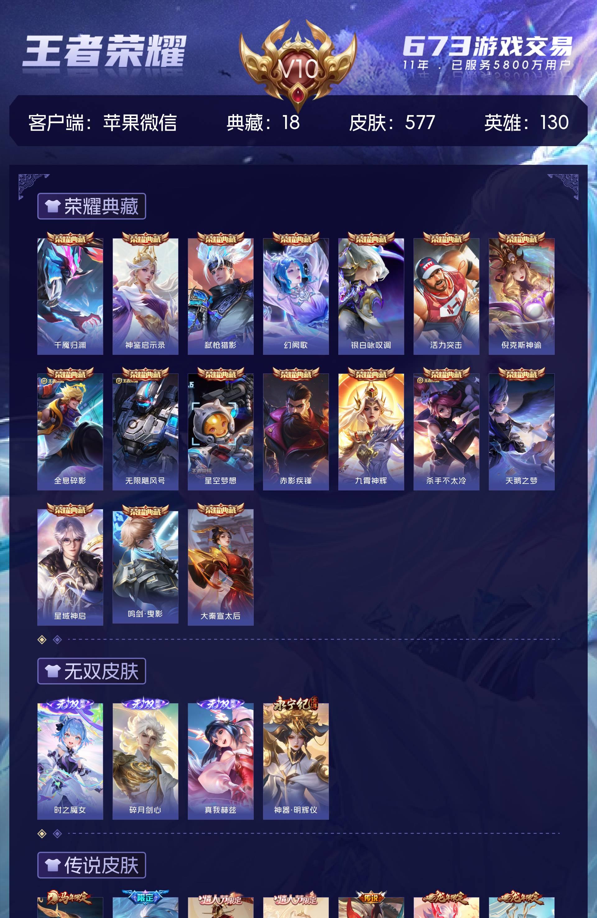 V10 皮肤577 英雄130 至尊星耀 荣耀典藏18 无双皮肤4 星传说11 传说97