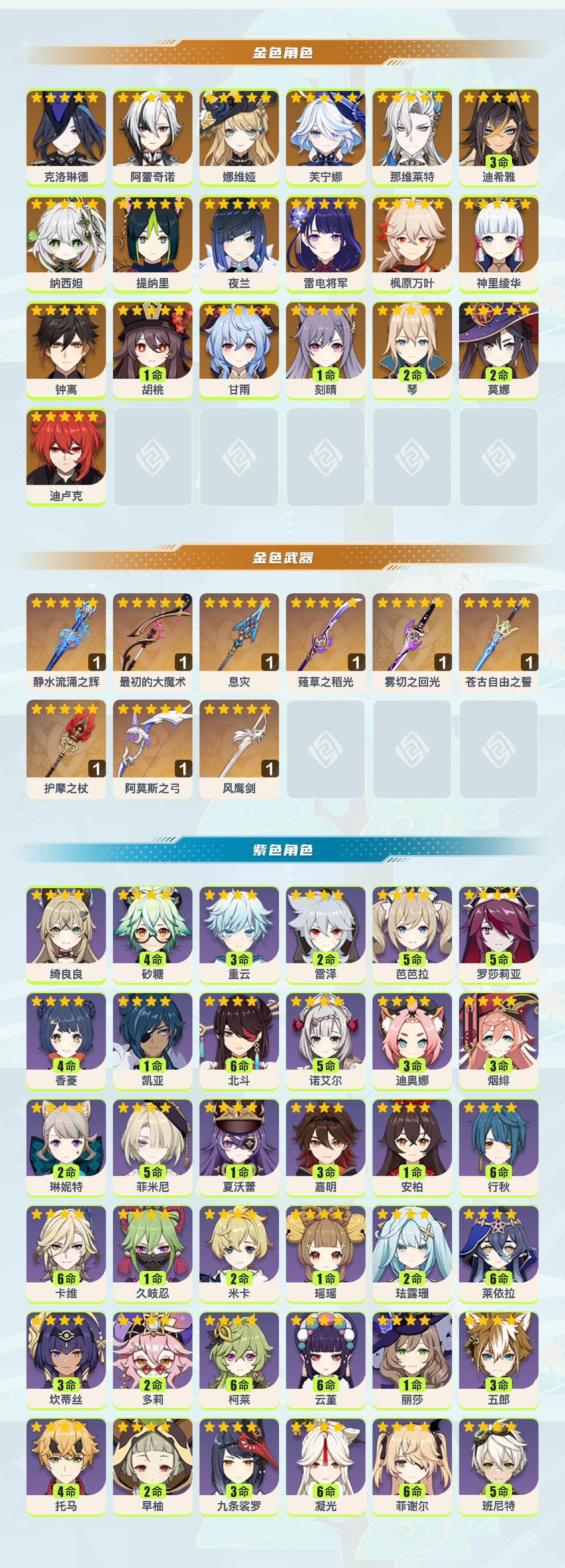 【金色角色】:克洛琳德(0命),阿蕾奇诺(0命),娜维娅(0命),芙宁娜(0命),那维莱特(0命),迪希雅(3命),纳西妲(0命),提纳里(0命),夜兰(0命),雷电将军(0命),神里绫华(0命),枫原万叶(0命),胡桃(1命),甘雨(0命),钟离(0命),琴(2命),刻晴(1命),迪卢克(0命),莫娜(2命)