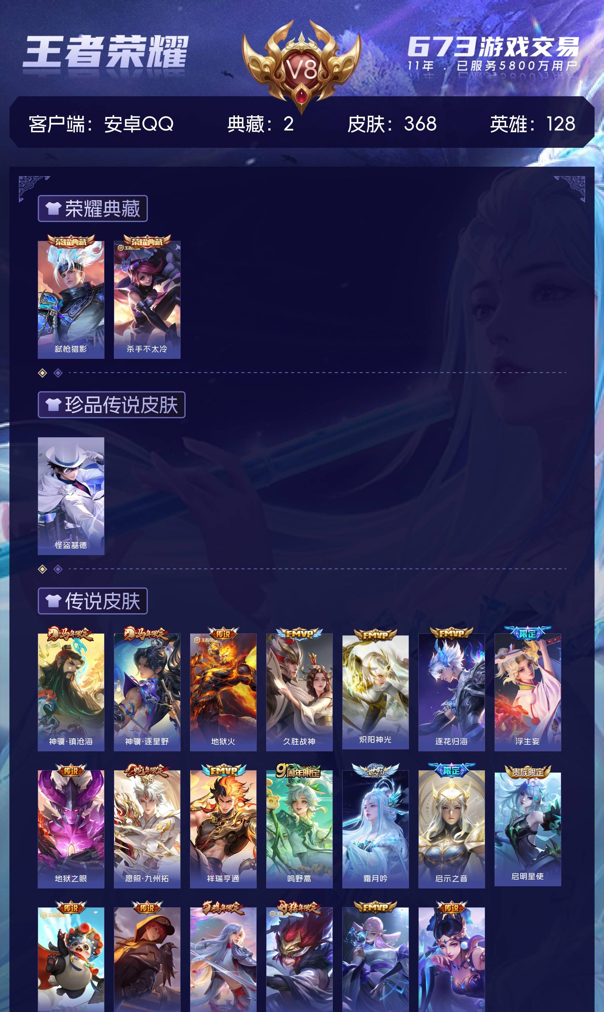 V8 皮肤368 英雄128 永恒钻石 荣耀典藏2 珍品传说1 星传说5 传说20