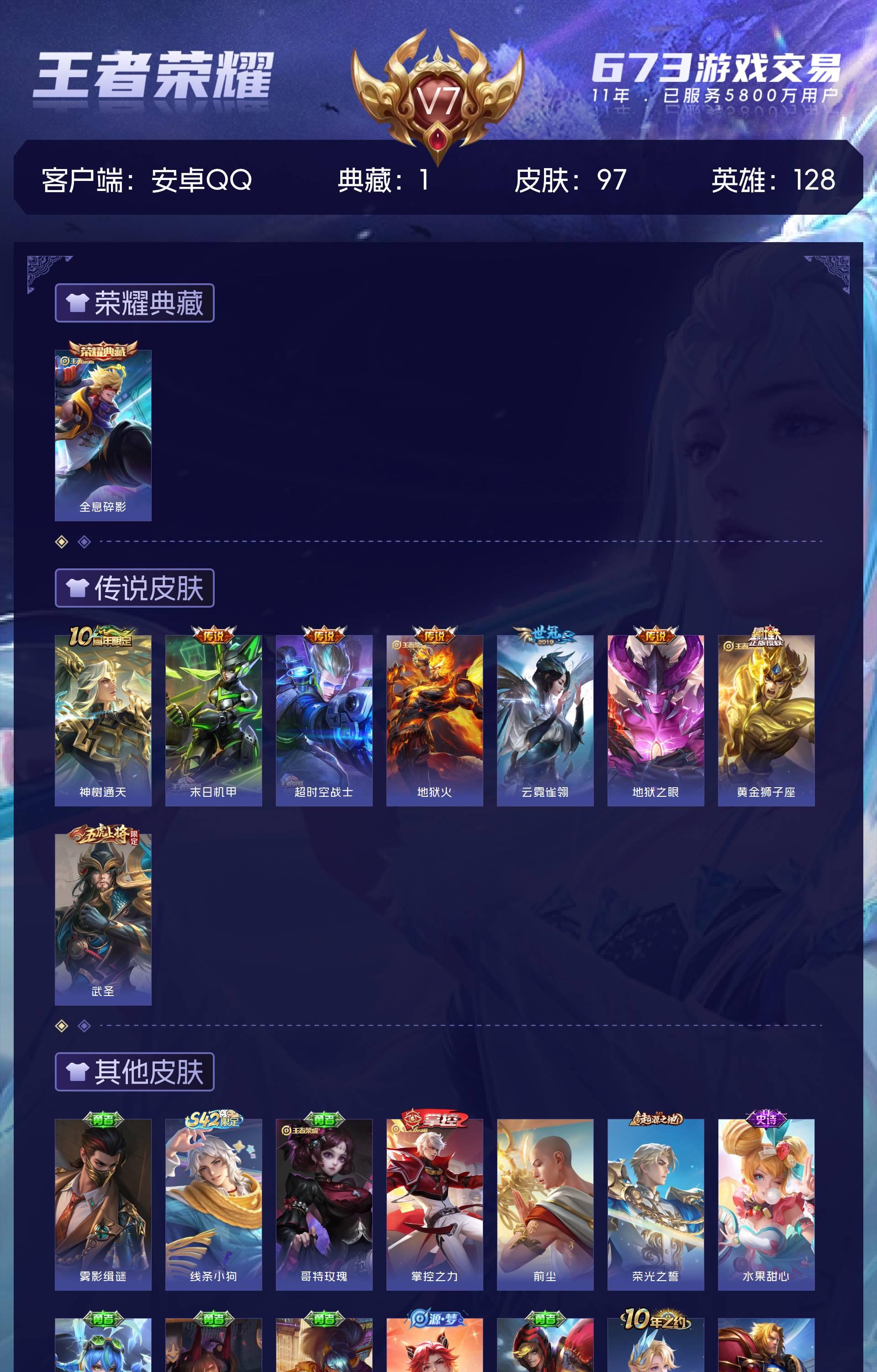 V7 皮肤97 英雄128 尊贵铂金 荣耀典藏1 传说8