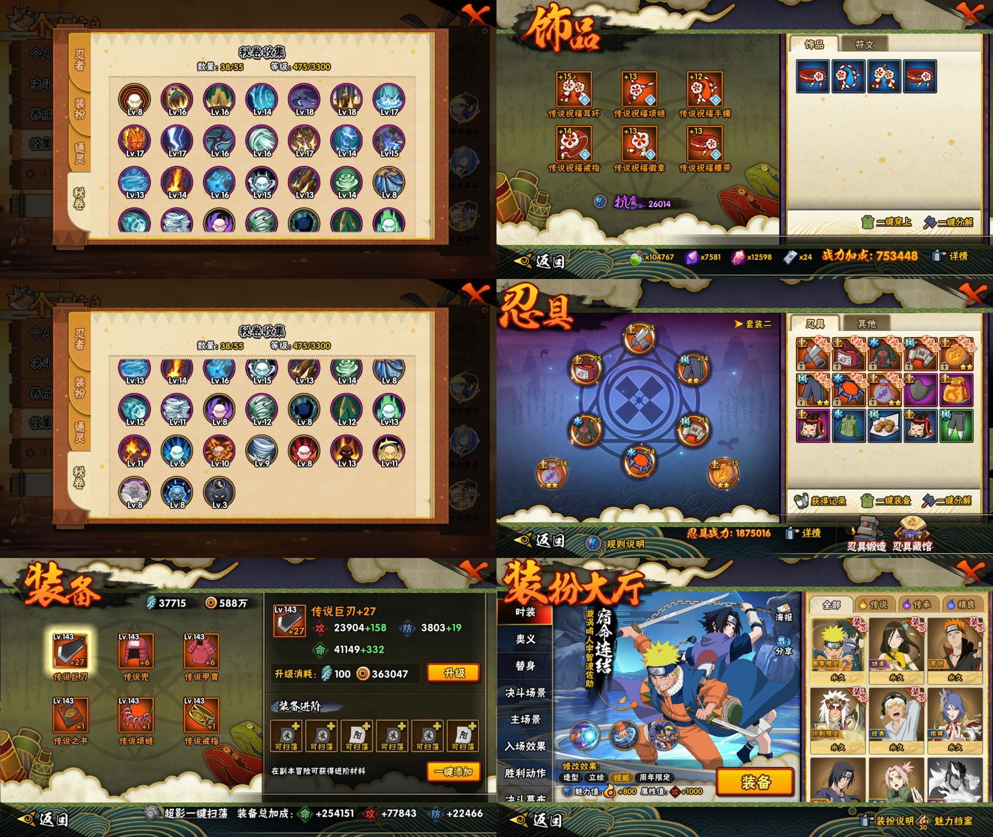 9S忍/25A忍/战力744W/V5/区服1582 【S忍者】宇智波佐助「漩涡鸣人」,自来也「舞之豪杰」,宇智波斑「秽土转生」,宇智波斑「白面具」,千手扉间「秽土转生」,纲手 月「仙人模式」,迈特凯「青春爆炸」,土台「忍界大战」,不缘,漩涡博人「桃式显现」,宇智波泉奈,桃地再不斩