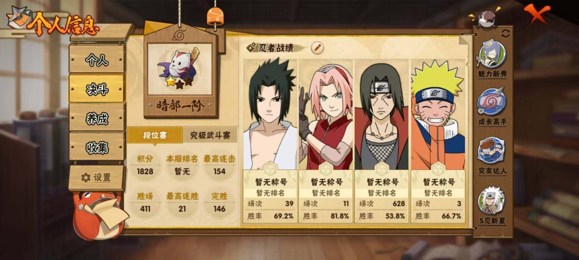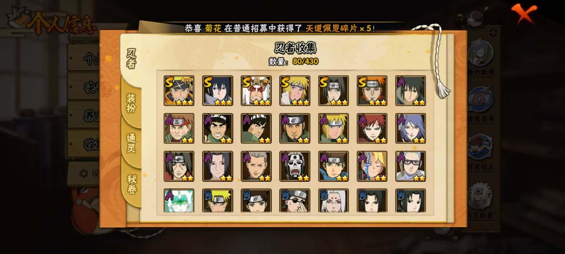 VIP等级V5/战力357W/S忍数量6/A忍数量16/舞之豪杰