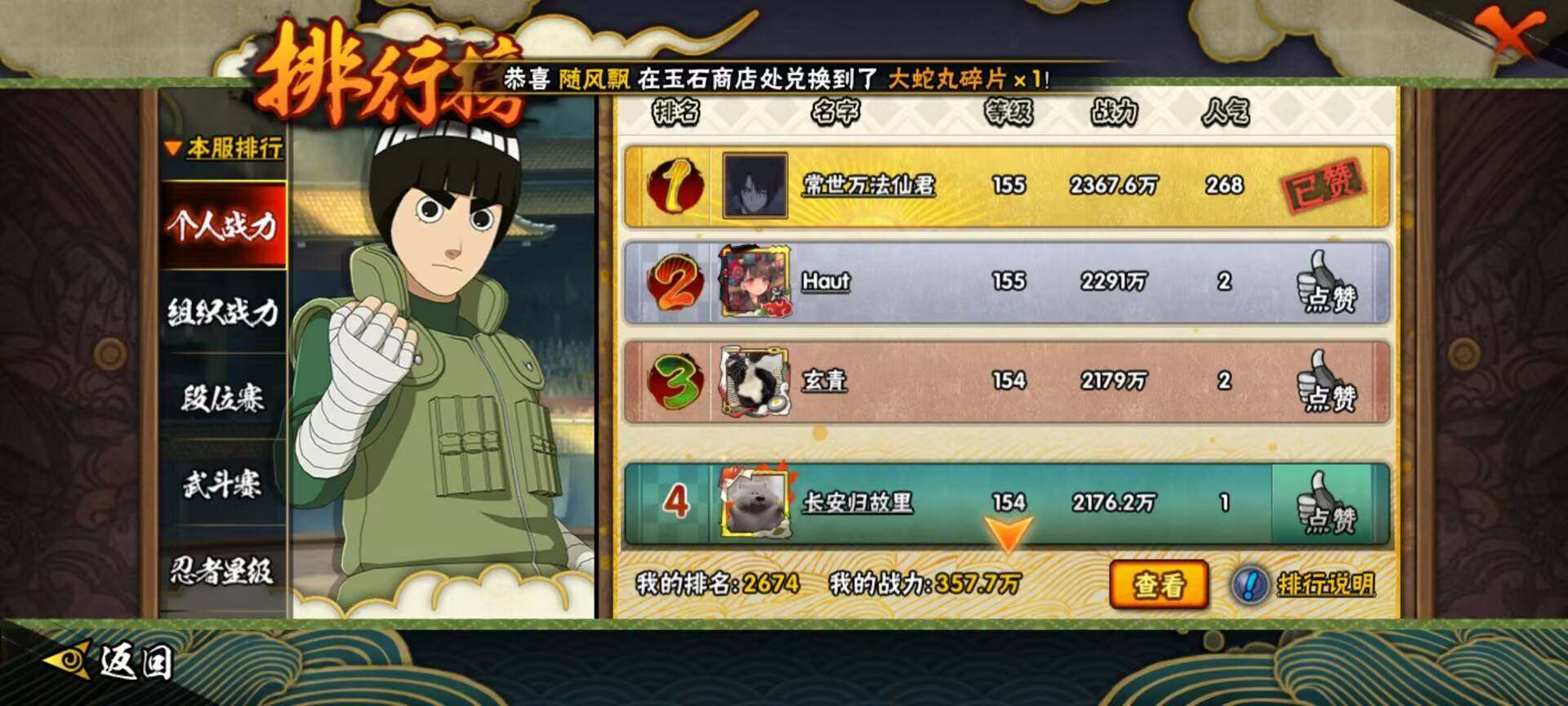 【HYD144】VIP等级V5/战力357W/S忍数量6/A忍数量16/舞之豪杰-自来也/疾风传-我爱罗/死司凭血-飞段/宇智波鼬/永恒万花筒-宇智波佐助/迈特凯/2星小南「神驹佑将」/天道-佩恩/飞段/3星漩涡鸣人·宇智波佐助/猿飞阿斯玛/波风水门/夏日限定-宇智波鼬/2星宇智波泉奈/忍界大战-秋道丁次/2星巳月「仙人模式」/桃式显现-漩涡博人/2星迈特凯「青春爆炸」/猿飞木叶丸/六代目水影-长十郎/须佐能乎-宇智波鼬/青年-波风水门