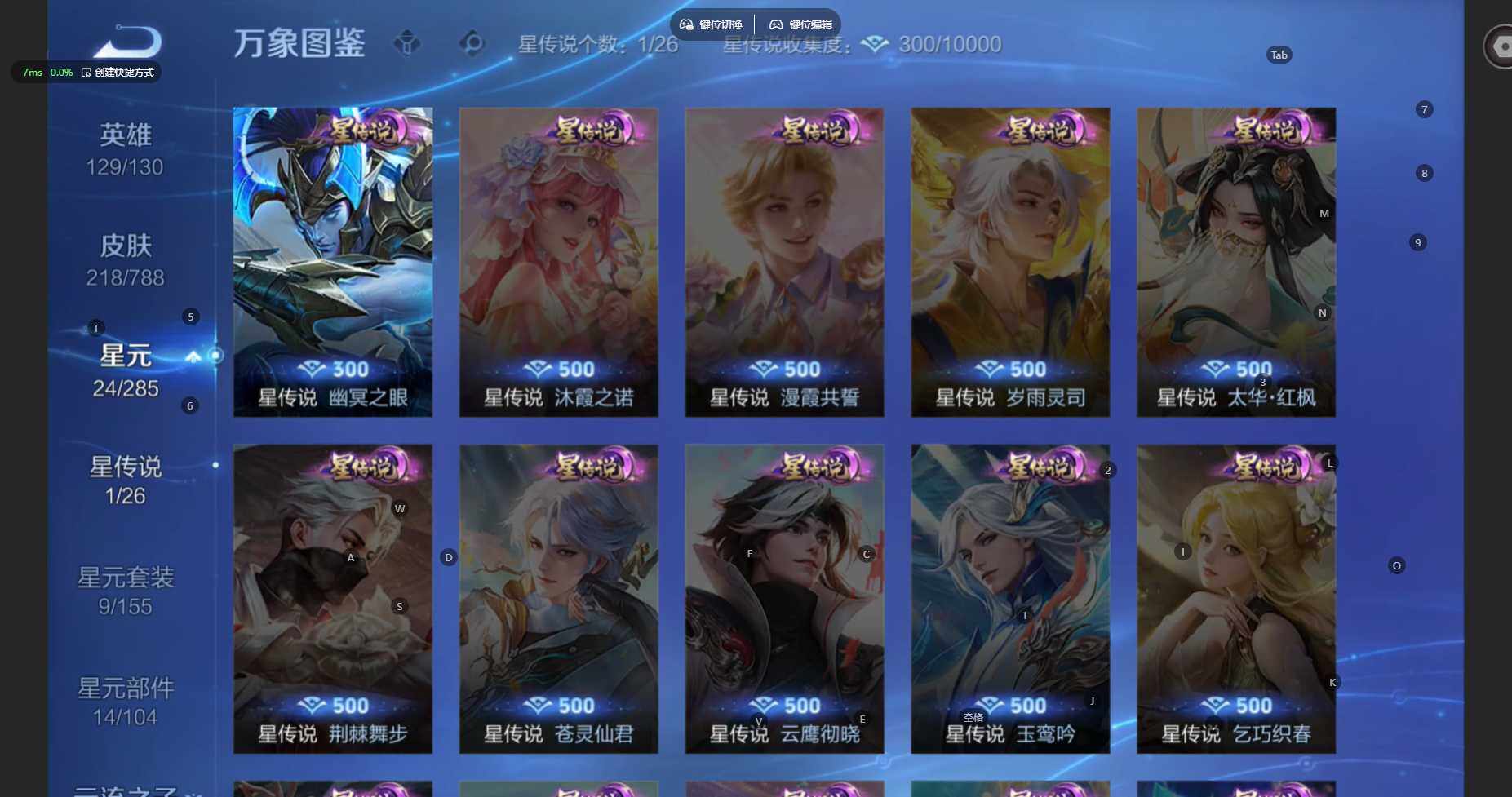 苹果WX-V7-至尊星耀I段位-129英雄-218皮肤-1典藏皮肤-4珍品传说-13传说-73史诗
