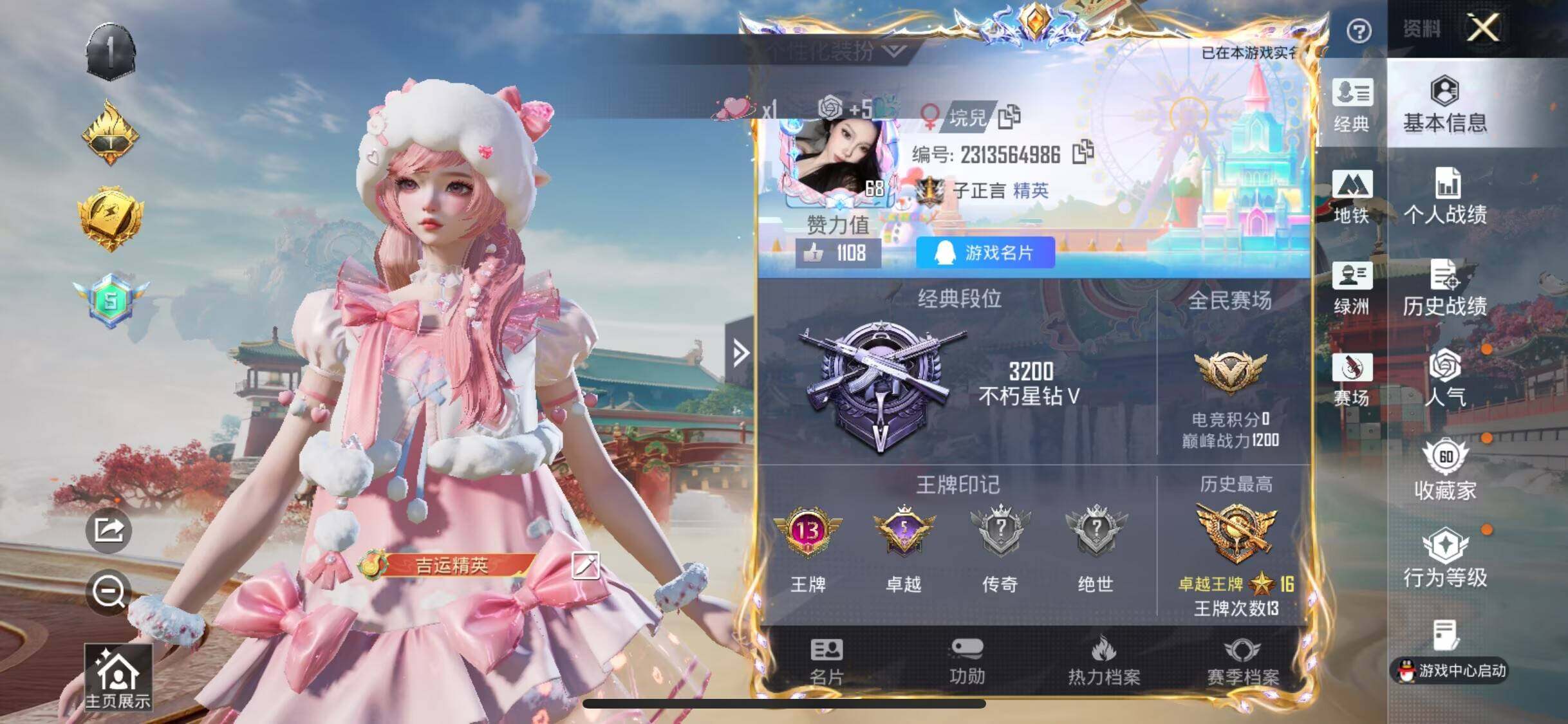 公主号-粉红小猪/彩虹鹿灵/山涧鹿灵/傲雪凌霜/金丰海韵/千金淑猫/羊梦糖心/AWM橘柚倾心七级(6粉装-4粉枪)没战神框HP7594-0载具-0粉色飞行器-55217热力值-13王牌印记-152套装-183枪皮