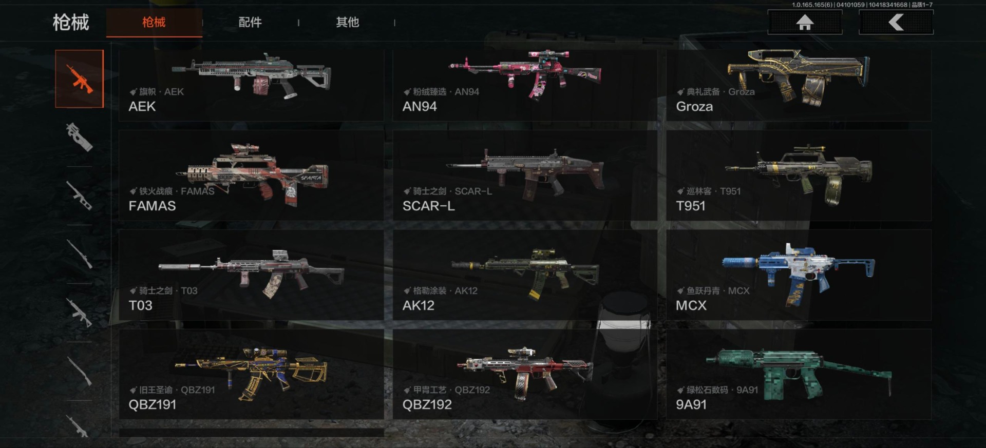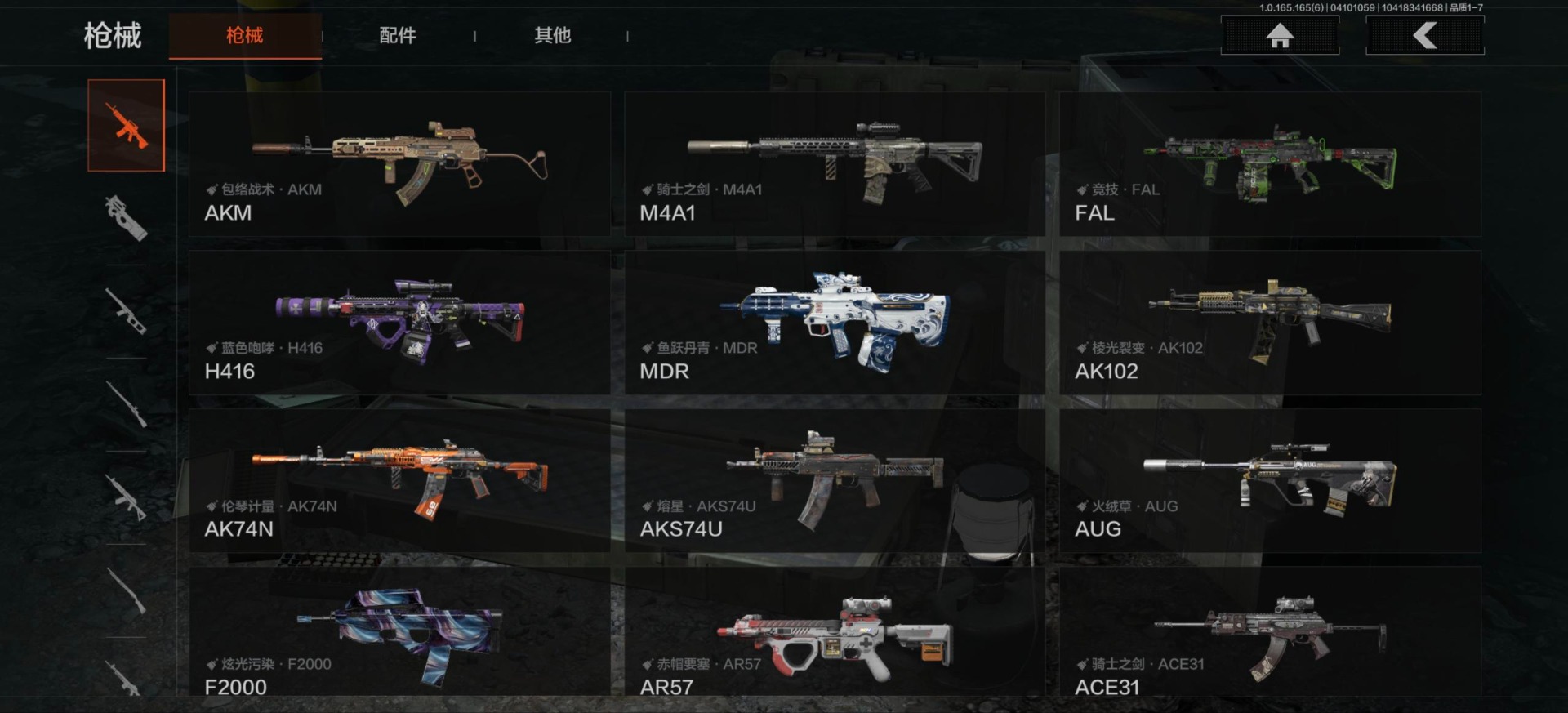 【金色枪皮】包络战术·AKM,赤帽要塞·AR57,蓝色咆哮·H416,旧王圣谕·VSS,旧王圣谕·QBZ191,伦琴幻影·AX50,利齿风暴·MPX,旗帜·AEK,竞技·FAL