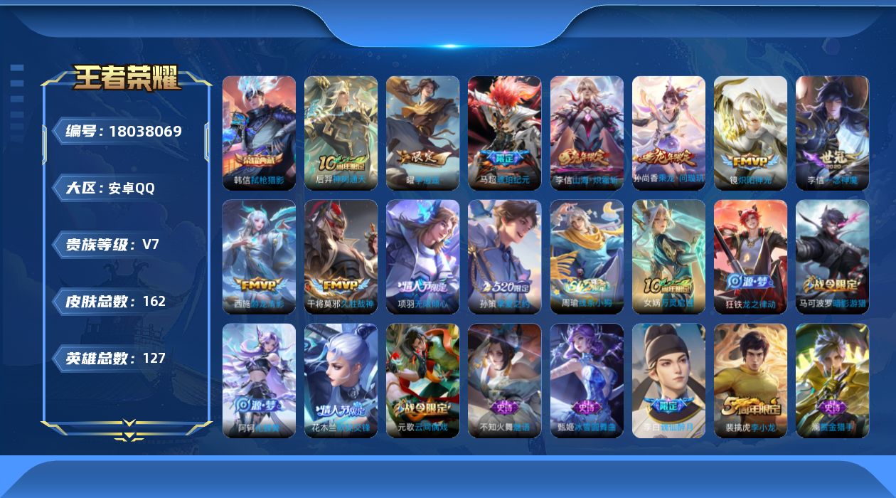 [18038069]实名: 不可修改 贵族等级: V7 英雄数: 127 皮肤数: 162 荣耀水晶: 弑枪猎影 传说皮: 久胜战神,炽阳神光,一念神魔,李逍遥,游龙清影,挚爱之约,山海·炽霜斩,琥珀纪元马超,乘龙·问璇玑,神树通天 限定皮: 李小龙,梁祝,天狼溯光者,默契交锋-花木兰,高山流水,无限倾心-项羽 亮点: 【精品号手慢无】3月30日可换绑,巅峰值1388,贵7性价比号,打野11段,星币2260,鲜花256,荣耀典藏弑枪猎影,传说皮久胜战神,炽阳神光,一念神魔,李逍遥,游龙清影,挚爱