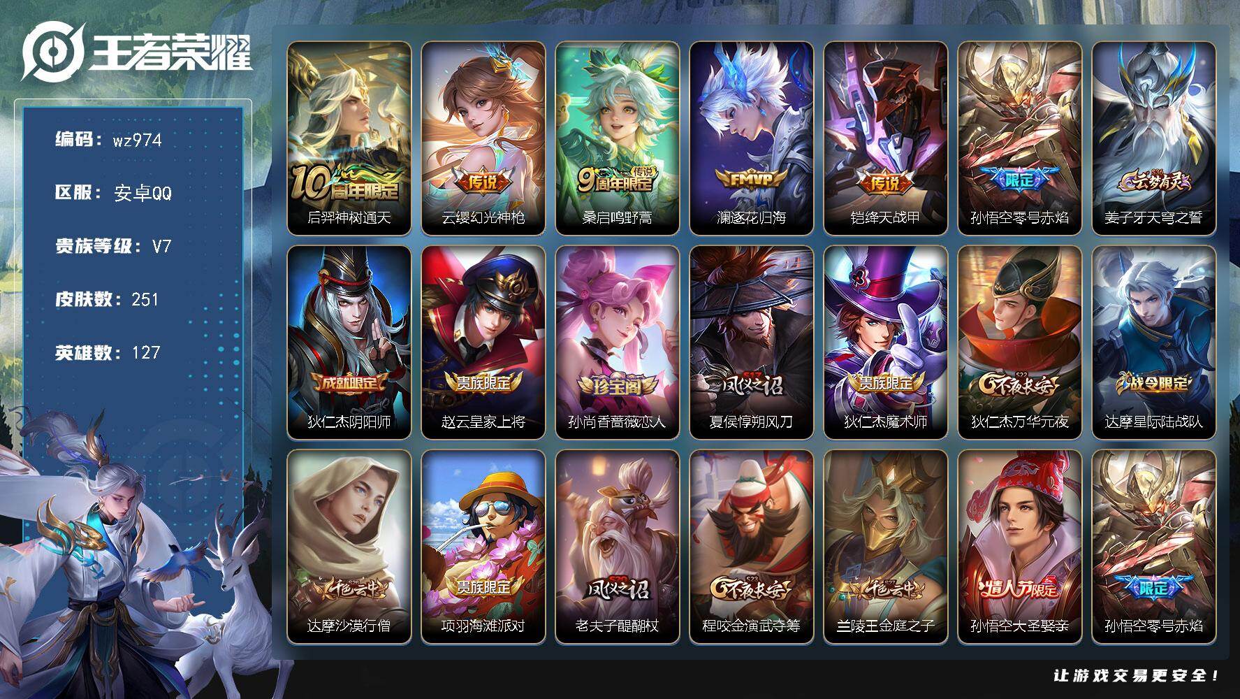 安卓Q-V7-永恒钻石IV段位-127英雄-251皮肤-6传说-45史诗【传说皮肤】:后羿神树通天,云缨幻光神枪,桑启鸣野蒿,澜逐花归海,铠绛天战甲,孙悟空零号赤焰【限定皮肤】:姜子牙天穹之誓,狄仁杰阴阳师,赵云皇家上将,孙尚香蔷薇恋人,夏侯惇朔风刀,狄仁杰魔术师,狄仁杰万华元夜,达摩星际陆战队,达摩沙漠行僧,项羽海滩派对,老夫子醍醐杖,程咬金演武夺筹,兰陵王金庭之子,孙悟空大圣娶亲,孙悟空零号赤焰,牛魔御旌,后羿圣弓游侠,李元芳云中旅人,钟馗驱傩正仪,鬼谷子原初探秘者,鬼谷子五谷丰年,苏烈千军