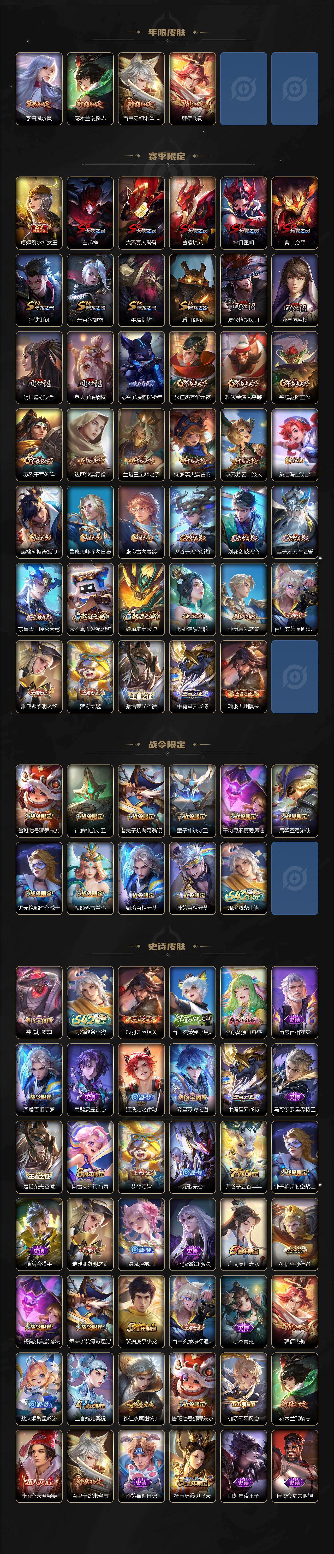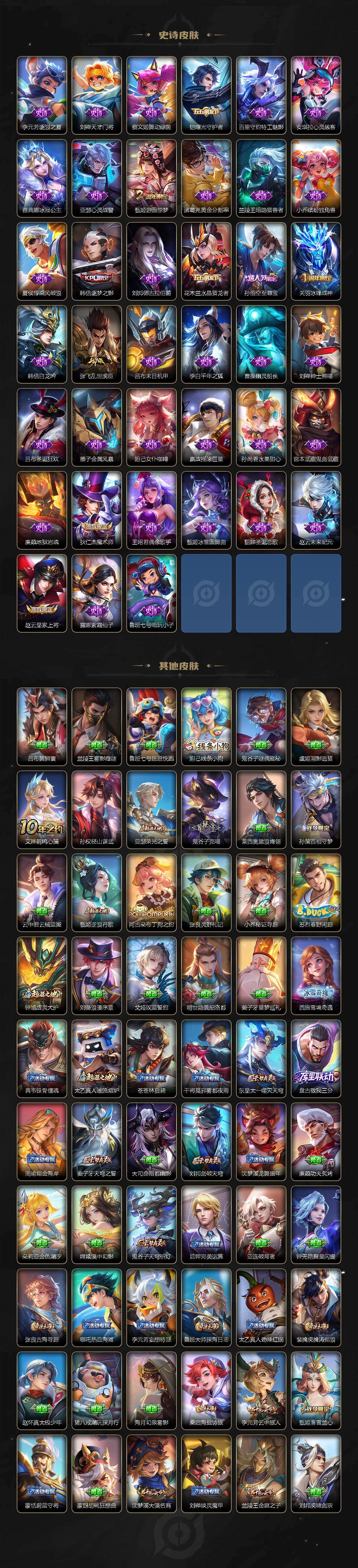 【限定皮肤】:白起狰,姜子牙天穹之誓,狄仁杰阴阳师,虞姬凯尔特女王,赵云皇家上将,墨子神迹守卫,鲁班七号狮舞东方,庄周高山流水