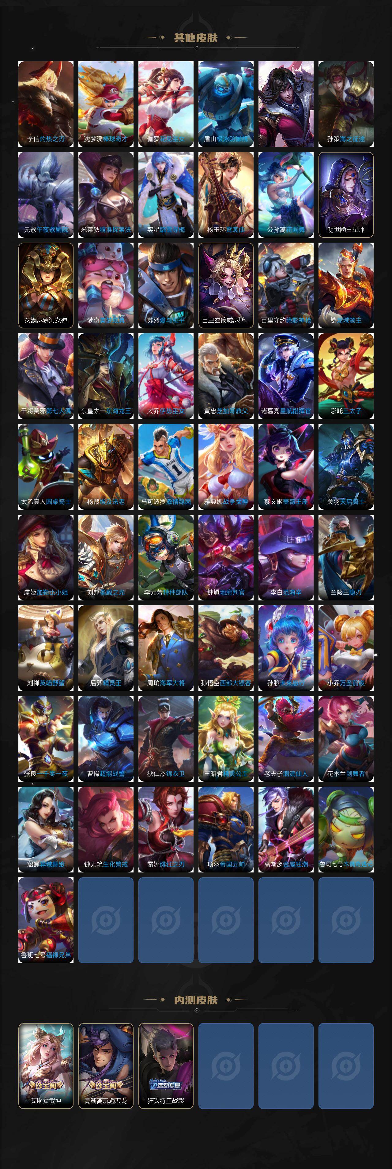 【传说皮肤】:马超神骥逐星野,后羿神树通天,桑启鸣野蒿,澜逐花归海,孙悟空齐天大圣,李白诗剑行,孙尚香音你闪耀,虞姬启明星使,曜云鹰飞将,李信一念神魔,干将莫邪久胜战神,李白凤求凰,宫本武藏地狱之眼,孙悟空地狱火,狄仁杰超时空战士