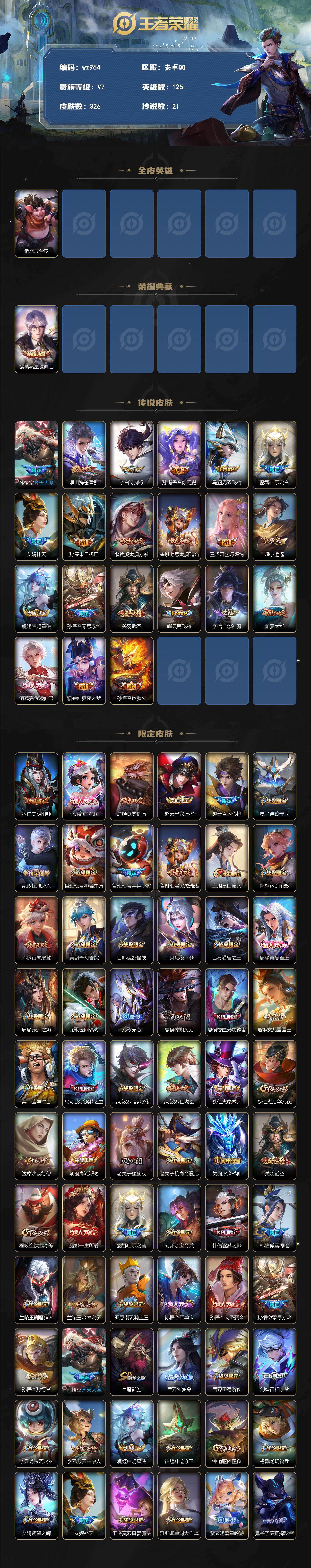 安卓Q-V7-至尊星耀V段位-125英雄-326皮肤-1典藏皮肤-21传说-106史诗【英雄全皮】:猪八戒全皮【荣耀典藏】:诸葛亮星域神启【传说皮肤】:孙悟空齐天大圣,曜山海苍雷引,李白诗剑行,孙尚香音你闪耀,马超无双飞将,露娜启示之音,女娲补天,孙策末日机甲,裴擒虎寅虎赤拳,鲁班七号寅虎瑞焰,王昭君乞巧织情,曜李逍遥 ,虞姬启明星使,孙悟空零号赤焰,关羽武圣,曜云鹰飞将,李信一念神魔,伽罗太华,诸葛亮武陵仙君,貂蝉仲夏夜之梦,孙悟空地狱火【限定皮肤】:狄仁杰阴阳师,小乔纯白花嫁,廉颇寅虎御盾,
