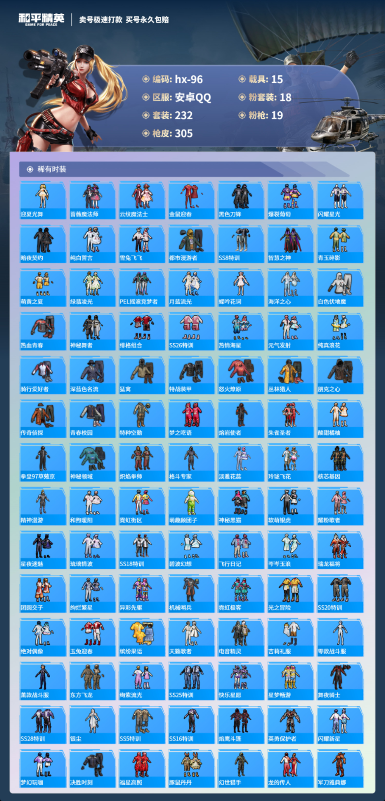 15载具232套装-305枪皮-安卓手Q-12王牌印记-18粉装-19特效枪-15载具-热力值-232套装-305枪皮-2卓越印记-1传奇印记