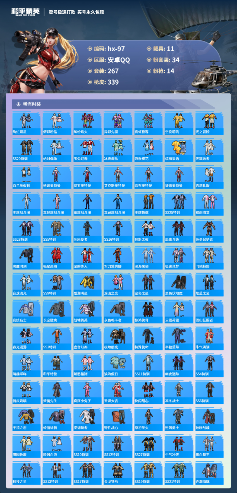 11载具267套装-339枪皮-安卓手Q-16王牌印记-34粉装-14特效枪-11载具-热力值-267套装-339枪皮-2卓越印记-0传奇印记