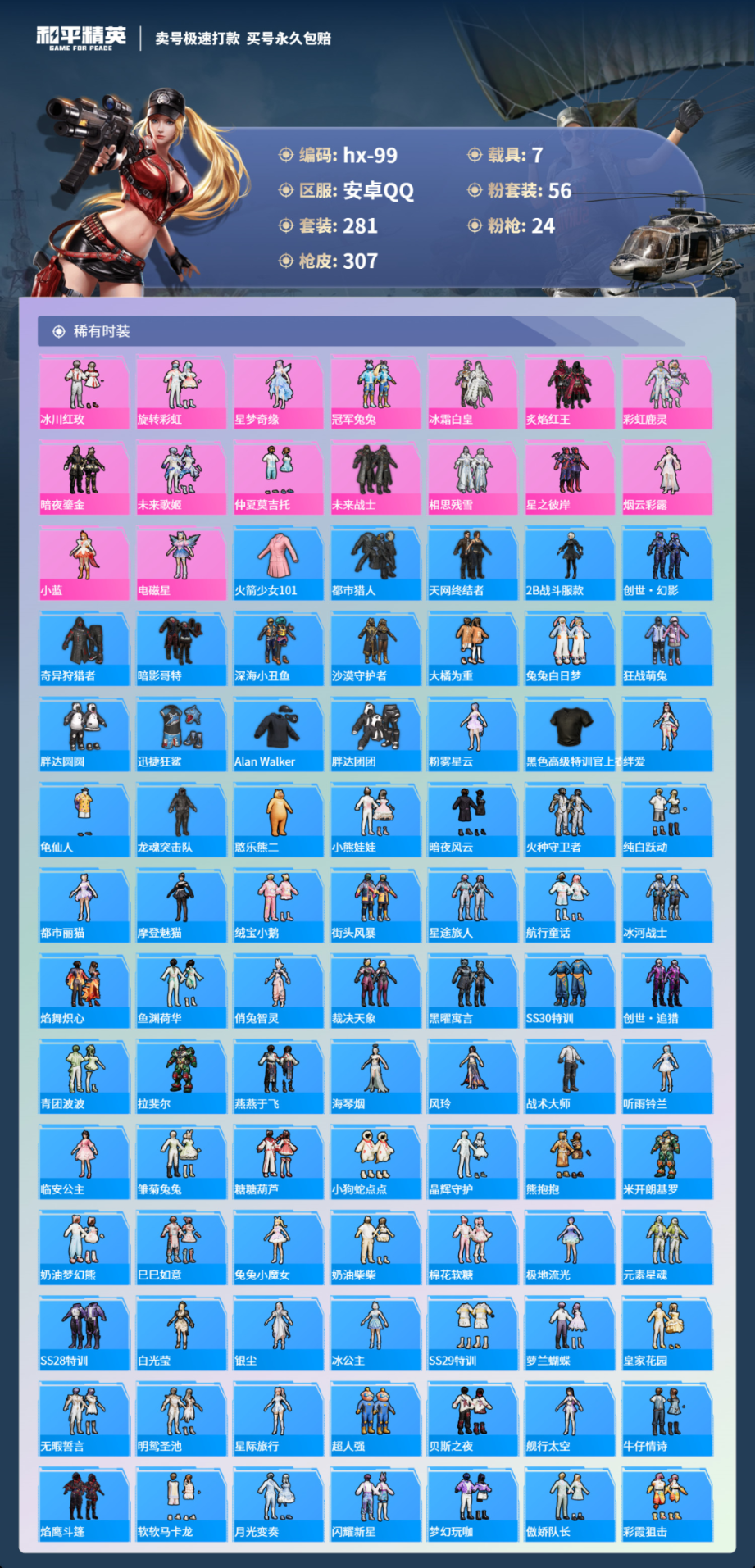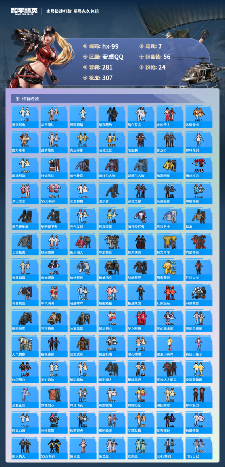 7载具281套装-307枪皮-安卓手Q-11王牌印记-有战神框-56粉装-24特效枪-7载具-热力值-281套装-307枪皮-5卓越印记-2传奇印记