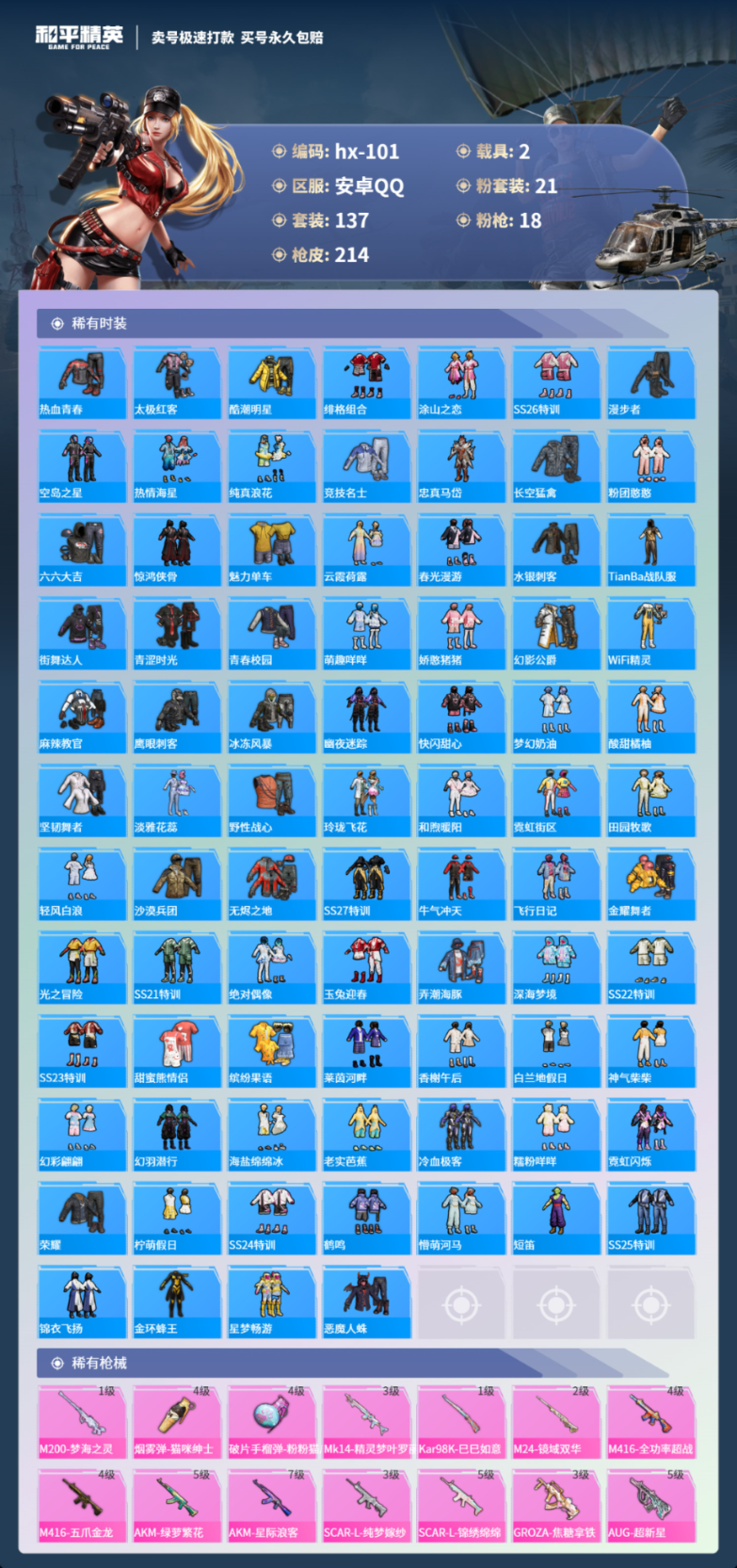 2载具137套装-214枪皮-安卓手Q-7王牌印记-有战神框-21粉装-18特效枪-2载具-81291热力值-137套装-214枪皮-2卓越印记-2传奇印记