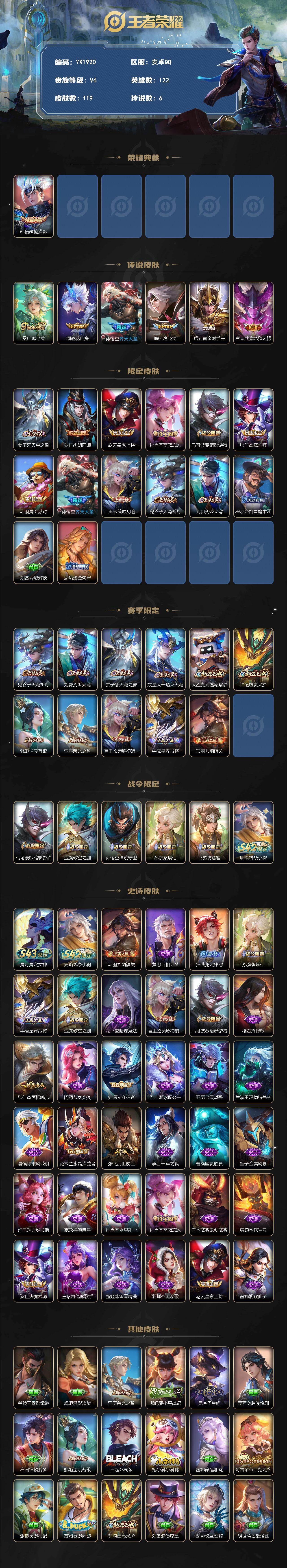 【弑枪猎影/逐花归海/齐天大圣】119皮肤1典藏6传说/鸣野蒿/云鹰飞将/黄金射手座/地狱之眼