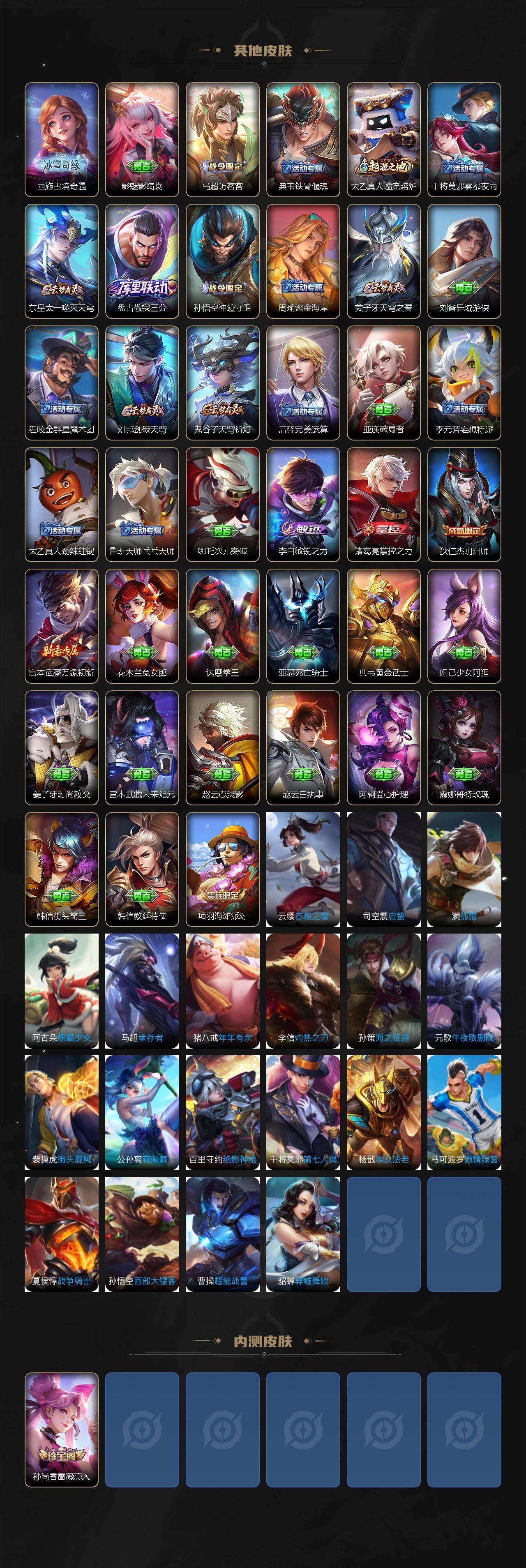 【限定皮肤】:姜子牙天穹之誓,狄仁杰阴阳师,赵云皇家上将,孙尚香蔷薇恋人,马可波罗暗影游猎,狄仁杰魔术师,项羽海滩派对,孙悟空齐天大圣,百里玄策原初追逐者,鬼谷子天穹祈灯,刘邦剑破天穹,程咬金群星魔术团,刘备异域游侠,周瑜熔金海岸