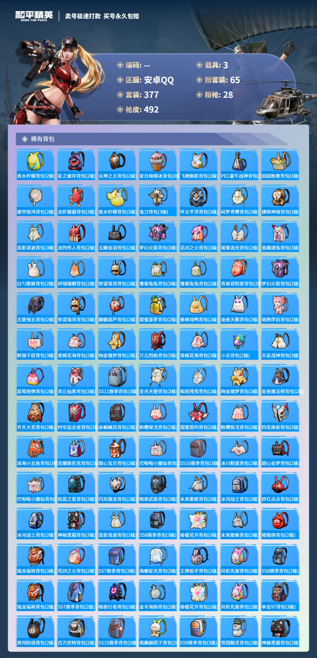 3载具377套装-492枪皮-安卓手Q-21王牌印记-65粉装-28特效枪-3载具-热力值-377套装-492枪皮-1卓越印记-0传奇印记