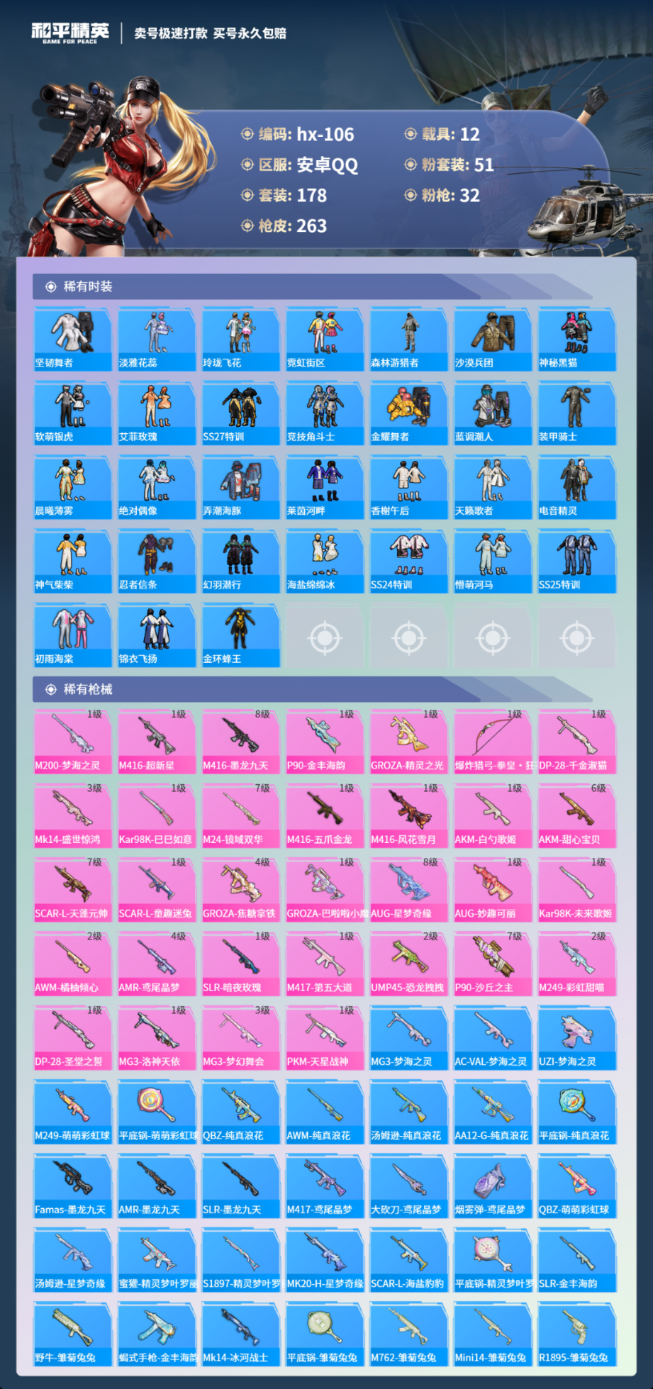12载具178套装-263枪皮-安卓手Q-6王牌印记-51粉装-32特效枪-12载具-热力值-178套装-263枪皮-1卓越印记-0传奇印记
