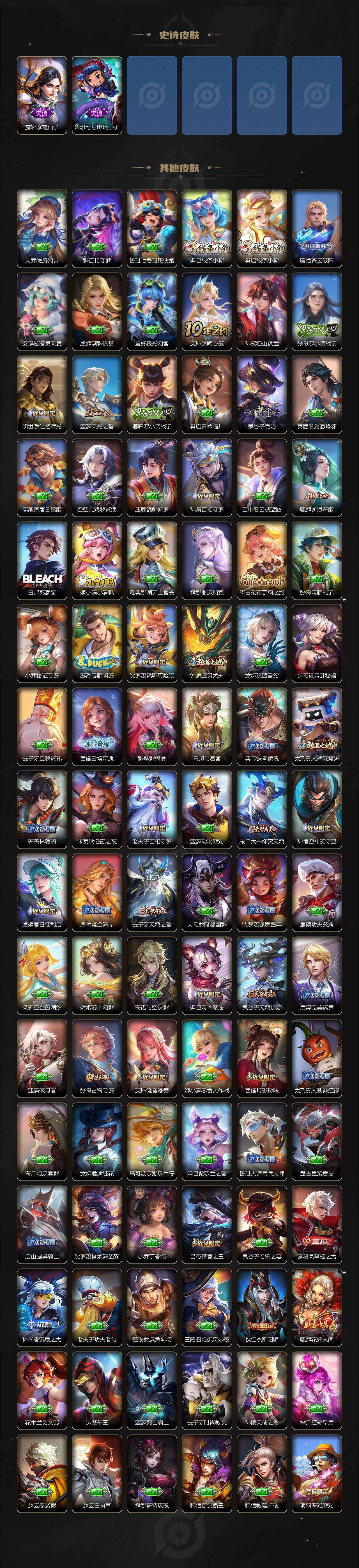 【传说皮肤】:后羿神树通天,澜愿照九州拓,桑启鸣野蒿,亚连落雪白狼,大乔时之奇旅,王昭君乞巧织情,西施游龙清影,虞姬启明星使,李信一念神魔,达摩黄金狮子座,花木兰冠军飞将,孙尚香末日机甲
