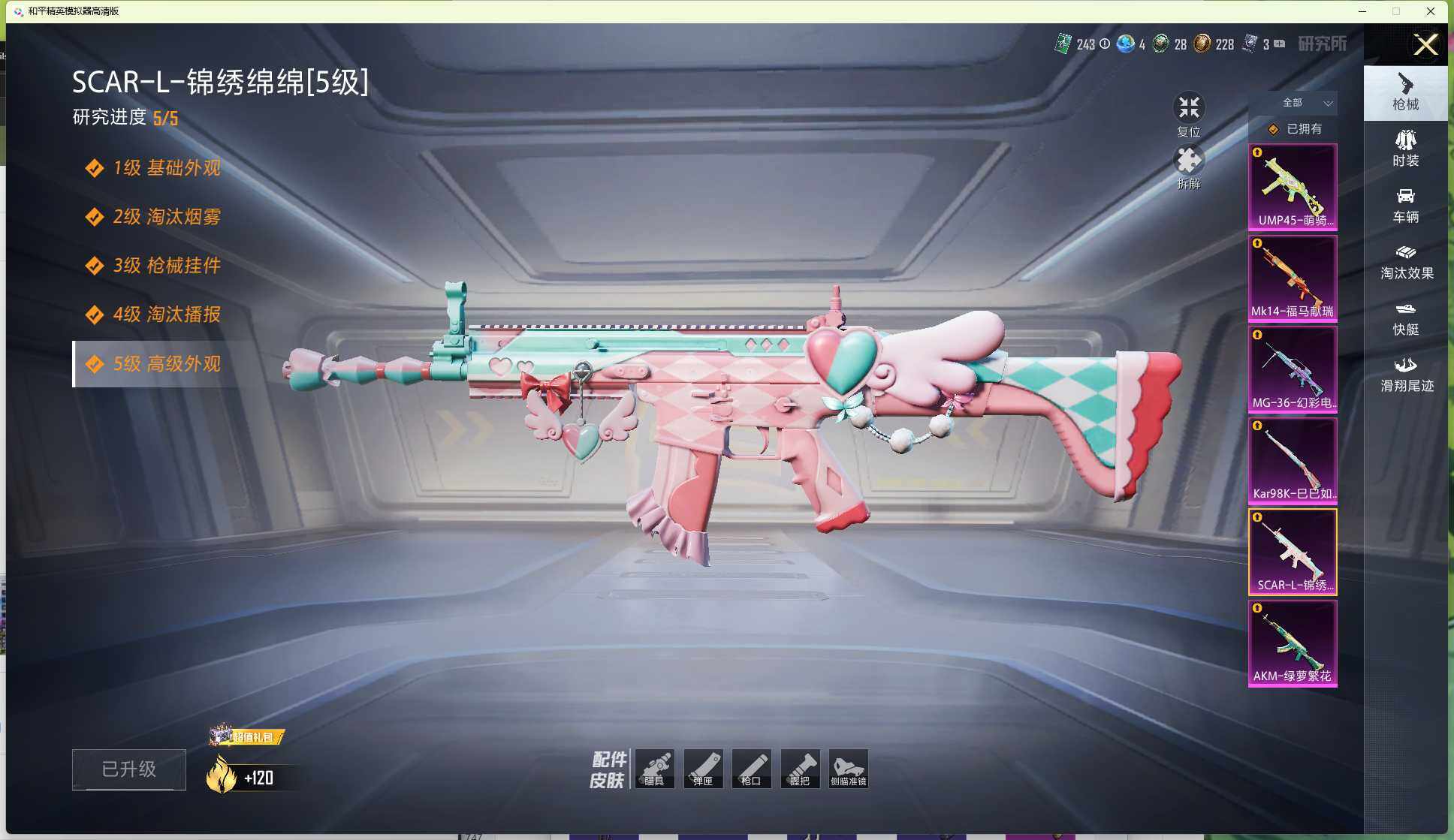 【粉色枪皮等级】:AKM-绿萝繁花(五级),SCAR-L-锦绣绵绵(五级),UMP45-萌骑冒险(三级),Kar98K-巳巳如意(五级),Mk14-福马献瑞(五级),MG-36-幻彩电音(五级)