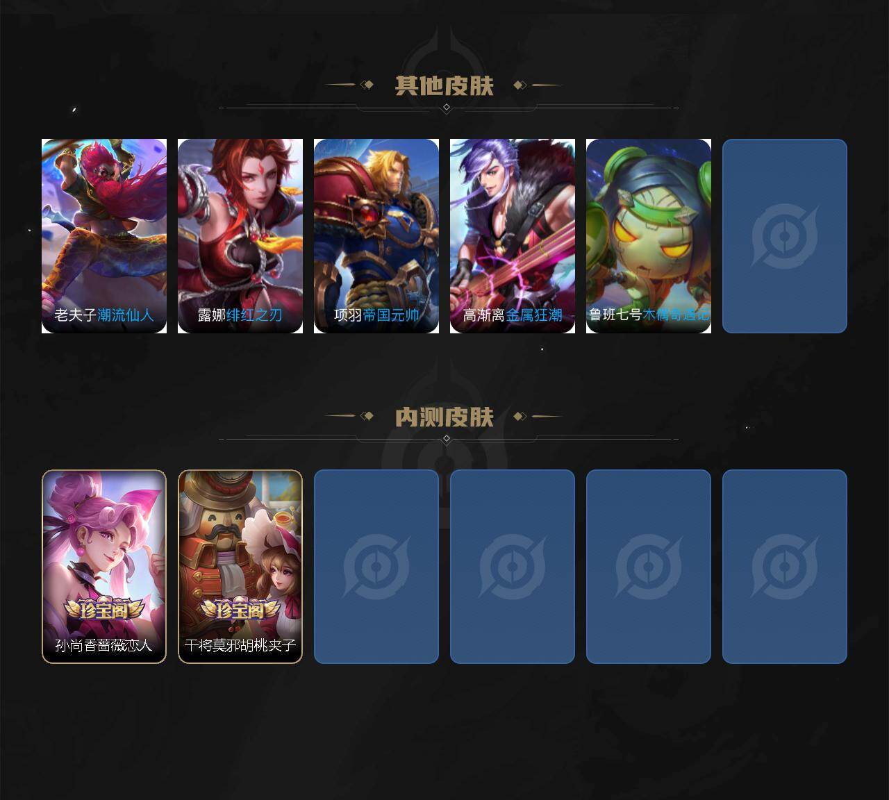 【限定皮肤】:白起狰,狄仁杰阴阳师,虞姬凯尔特女王,赵云皇家上将,妲己时之彼端,嬴政白昼王子,孙尚香蔷薇恋人,鲁班七号狮舞东方,阿轲迷踪丽影,芈月重明,吕布猎兽