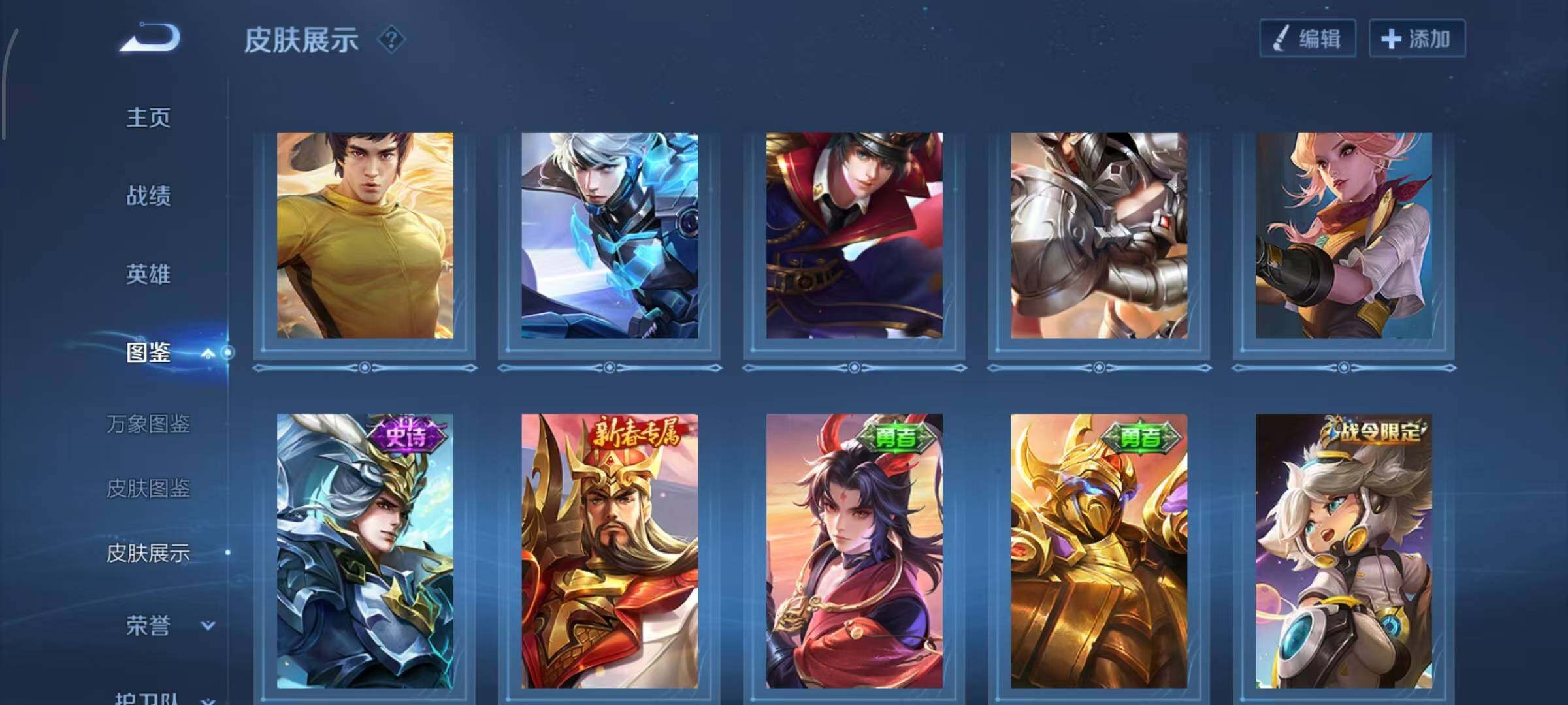 【限定皮肤】:狄仁杰阴阳师,赵云皇家上将,赵云龙胆,嬴政优雅恋人,阿轲迷踪丽影,钟无艳王者之锤,周瑜赤莲之焰,元歌云间偶戏,夏侯惇朔风刀,