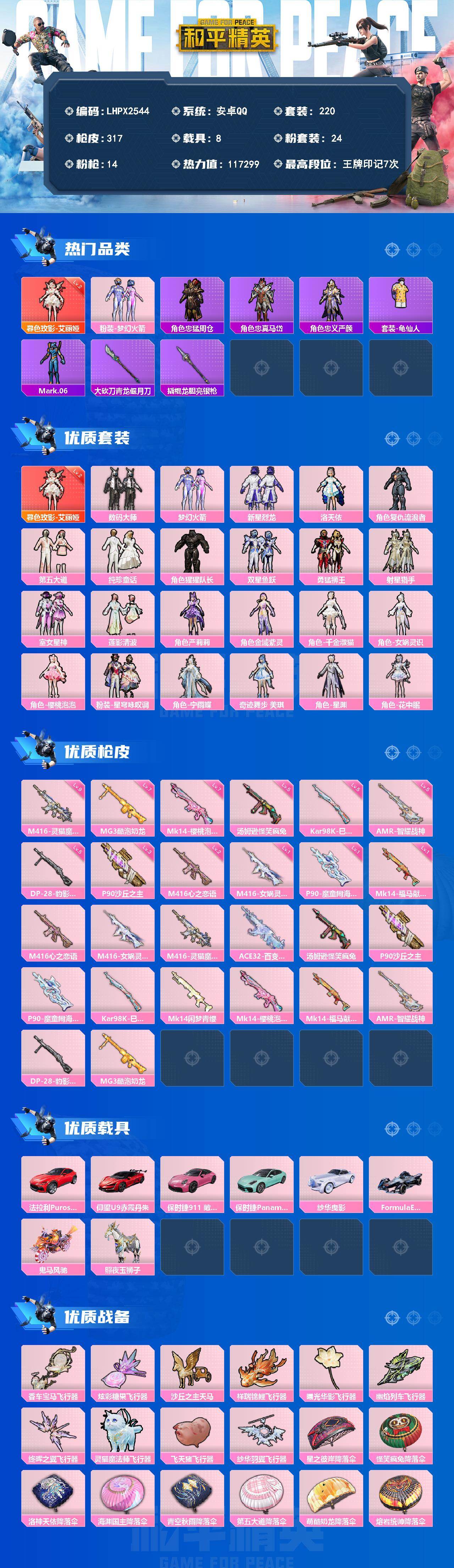 M416-灵猫魔法师(九级)/扭蛋碎片532/璀璨碎片1131【特价出售/店主推荐--热门套装新101小螳螂洛天依】安卓 手Q-1神装-24粉装-14特效枪-8载具-10粉色飞行器-117299热力值-7王牌印记-220套装-317枪皮【红色神装等级】:暮色玫影-艾丽娅(二级)【热门品类】:粉装-梦幻火箭,角色-忠猛周仓,角色-忠真马岱,角色-忠义严颜,套装-龟仙人,角色-Mark.06,大砍刀