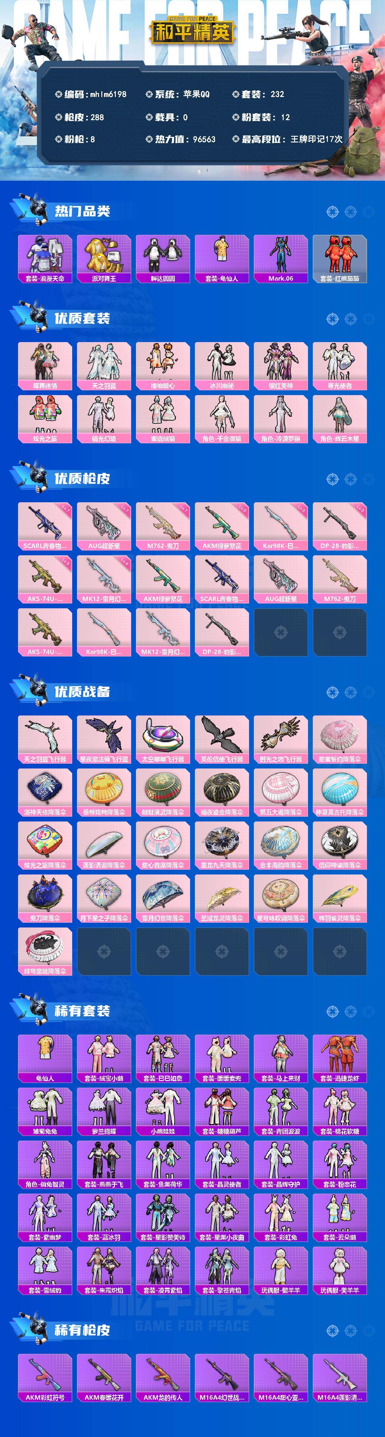 【mhlm6198】苹果 手Q-12粉装-8特效枪-0载具-6粉色飞行器-96563热力值-17王牌印记-232套装-288枪皮