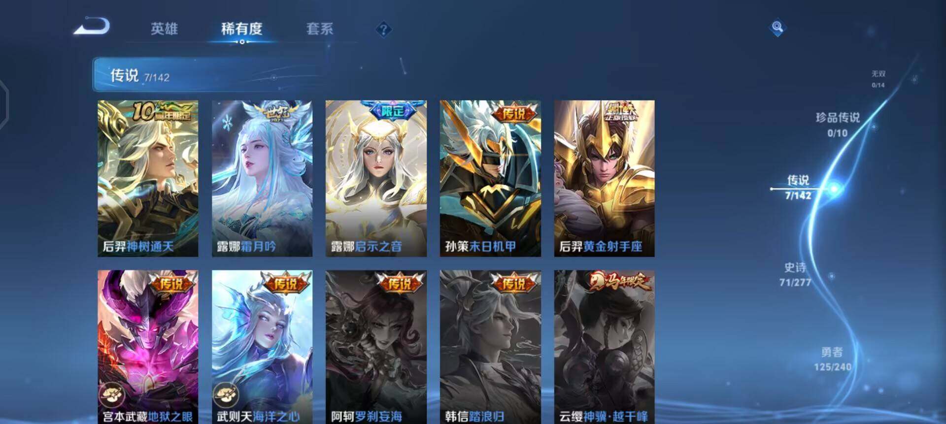 【传说皮肤】:后羿神树通天,露娜霜月吟,露娜启示之音,孙策末日机甲,后羿黄金射手座,宫本武藏地