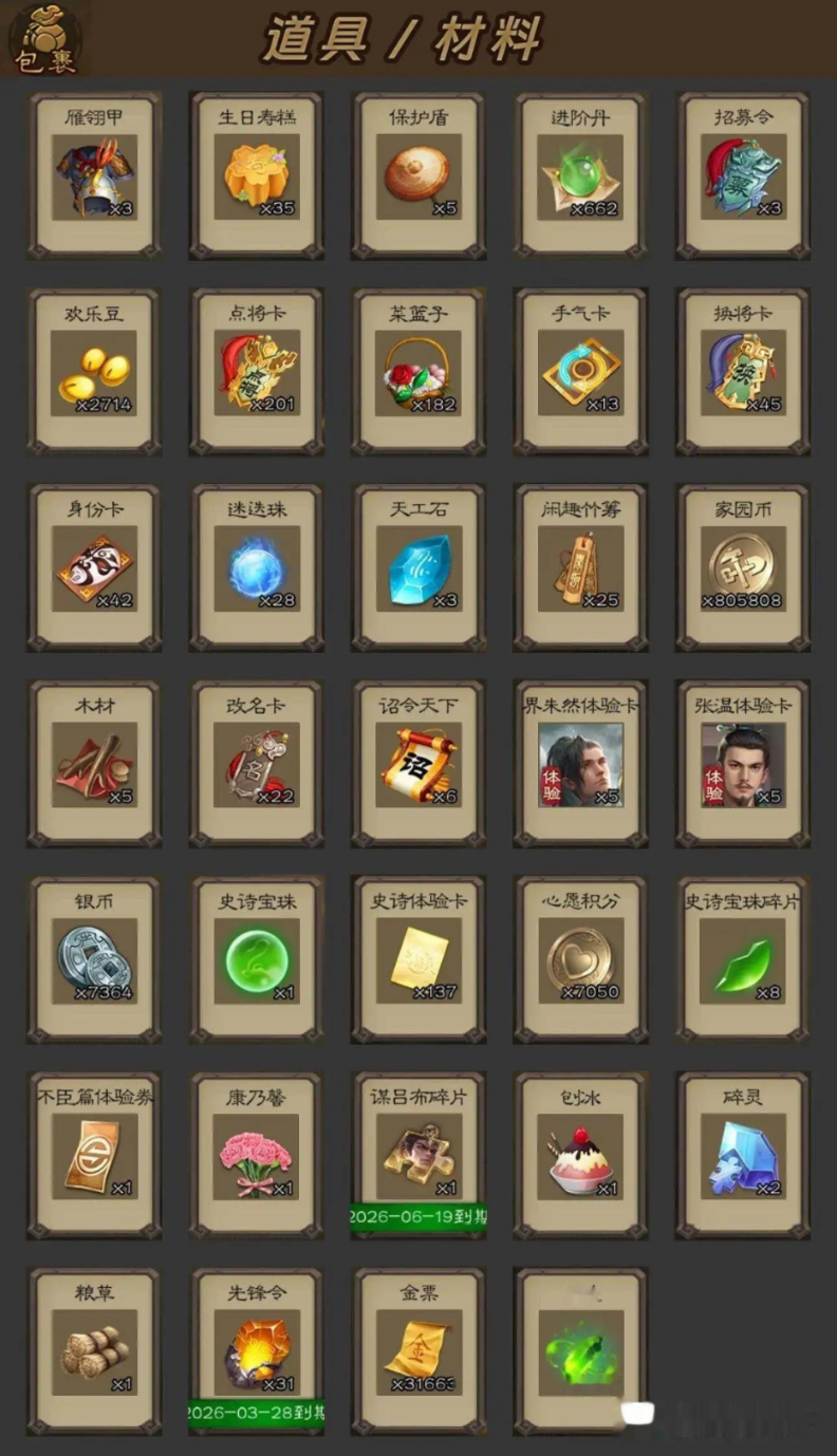 VIP7骠骑将军,301武将,332皮肤,23动皮,1史诗宝珠,27史诗武将:四星曹纯、四星杜预、四星界徐盛、四星界李儒、四星谋黄忠、四星麹义、兀突骨、周处、左慈、戏志才、星周不疑、杨修、沙摩柯、王平、界于禁、界钟会、神吕布、神吕蒙、神周瑜、神张辽、神赵云、神陆逊、程昱、花鬘、苏飞、谋张角、谋马超、赵襄、马云騄 谋张飞、李傕 义除三害·周处,201点将卡,45换将卡,13手气卡