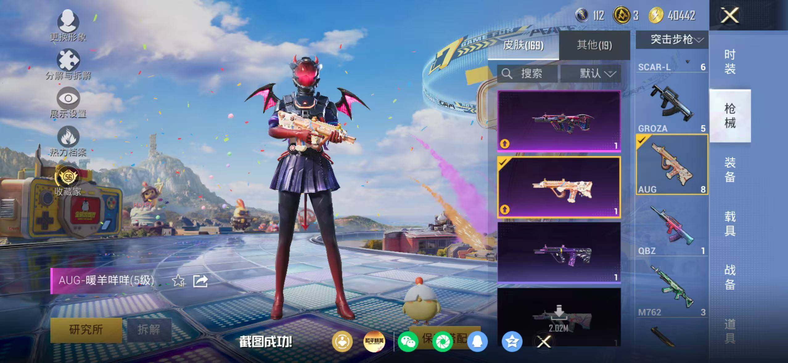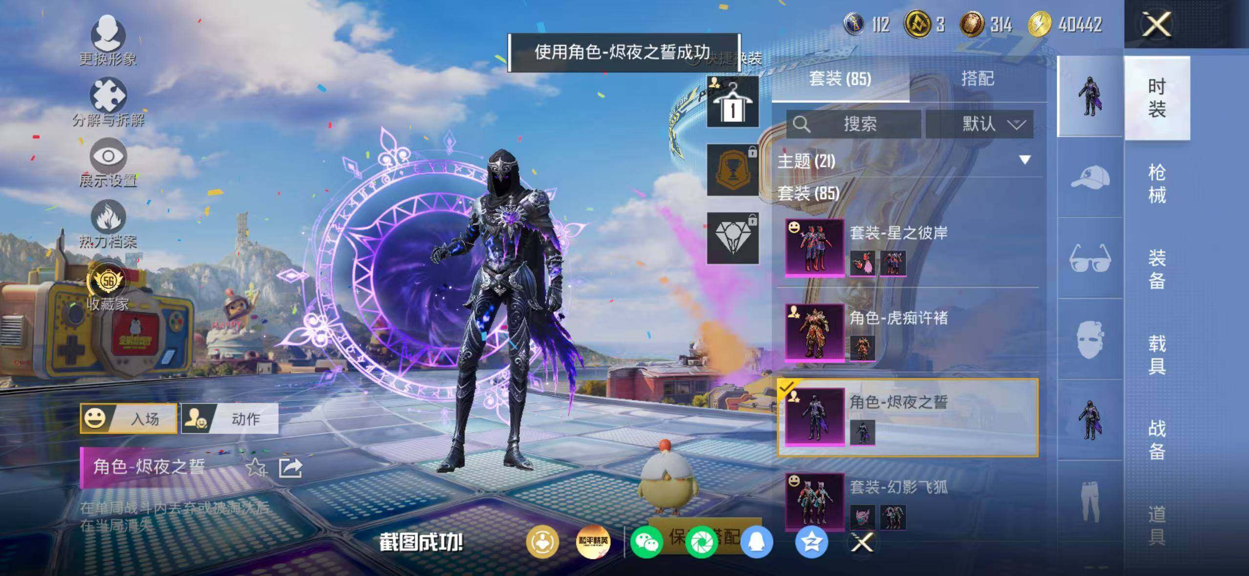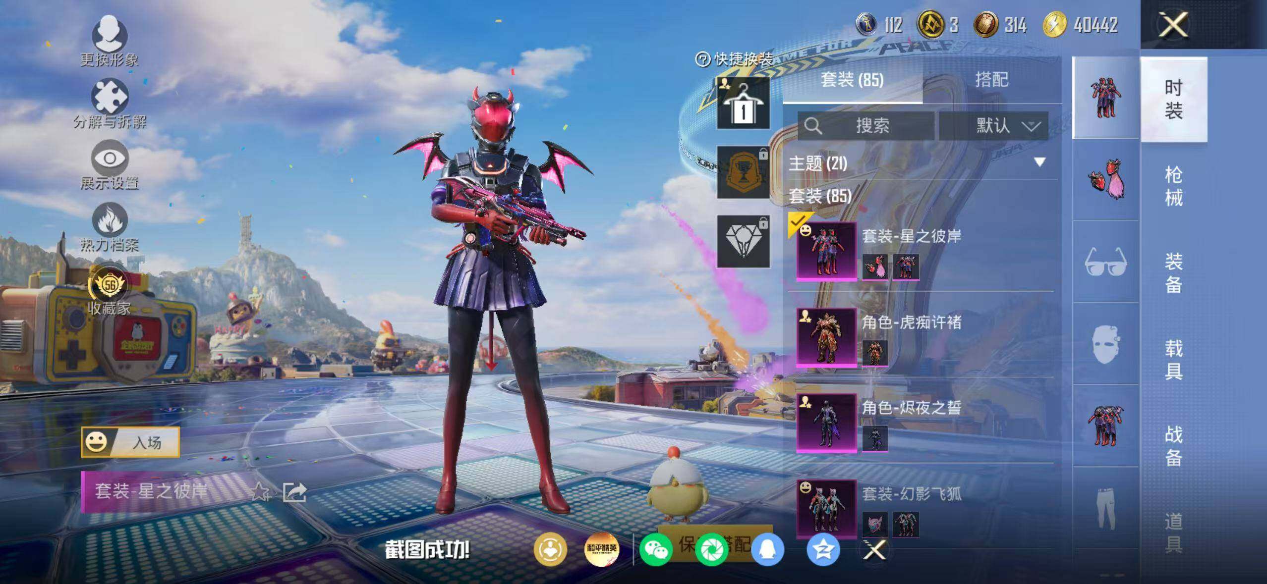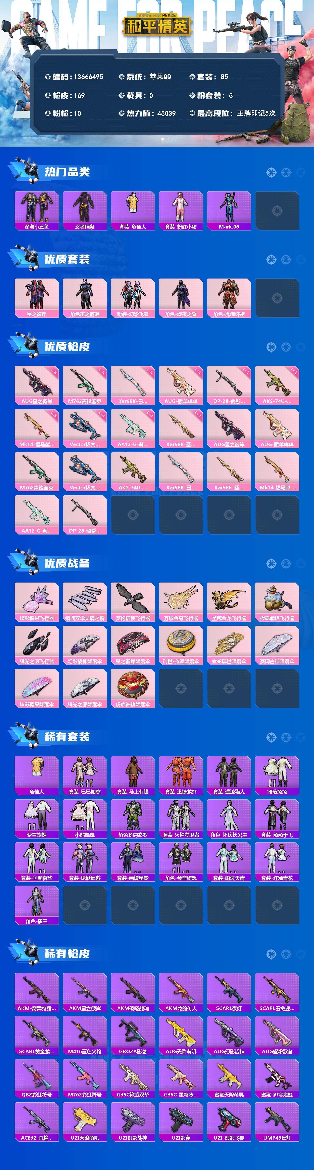 85套装/枪械10/装备202/战备92/王牌印记5/热力值45039/六级AUG-星之彼岸/五级AUG-暖羊咩咩/五级M762-青锋波束/四级Vector-环太平洋/五级AKS-74U-森灵之息/五级Kar98K-巳巳如意/三级Kar98K-圣域龙灵/五级Mk14-福马献瑞/四级AA12-G-萌骑幻想/五级DP-28-豹影疾电/深海小丑鱼/忍者信条/套装-龟仙人/套装-粉红小猪/角色-Mark